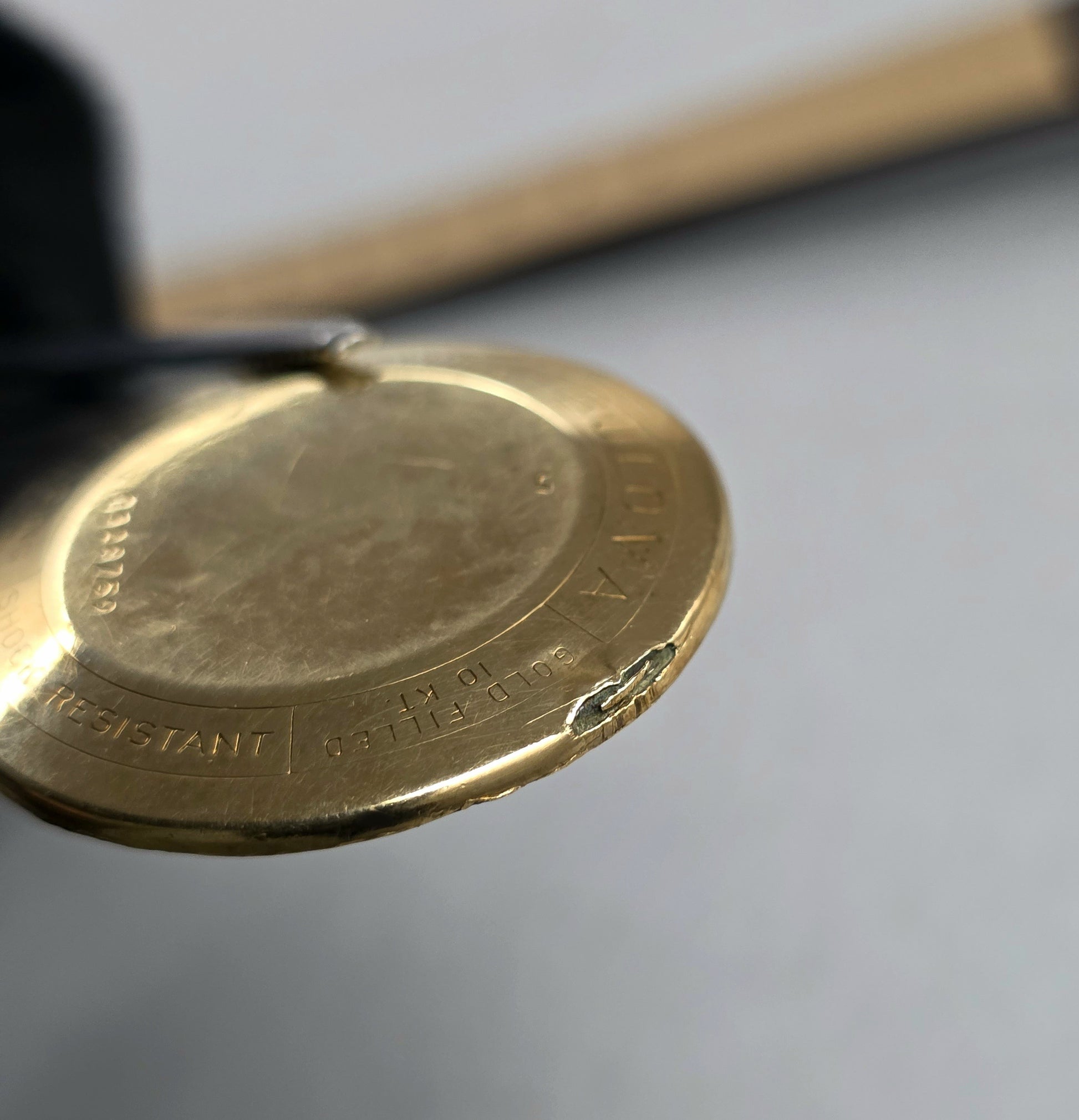 Case: Good gold-filled finish; small imperfection/chip on the case back edge due to opening marks, but not noticeable.