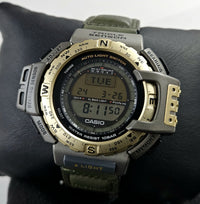 The Casio ProTrek PRT-400 is an older ProTrek model that was released in the 1990s and features triple sensor technology. This means the watch has a built-in barometer, altimeter and thermometer. It also has a digital display that shows the time, date and other information. It also has digital compass and chronograph functions. The watch is water resistant up to 100 meters. Since it is an old model, you need to be careful about water. This item was purchased from a vintage watch store in Japan and is an old stock item. You will be the first to use this product.