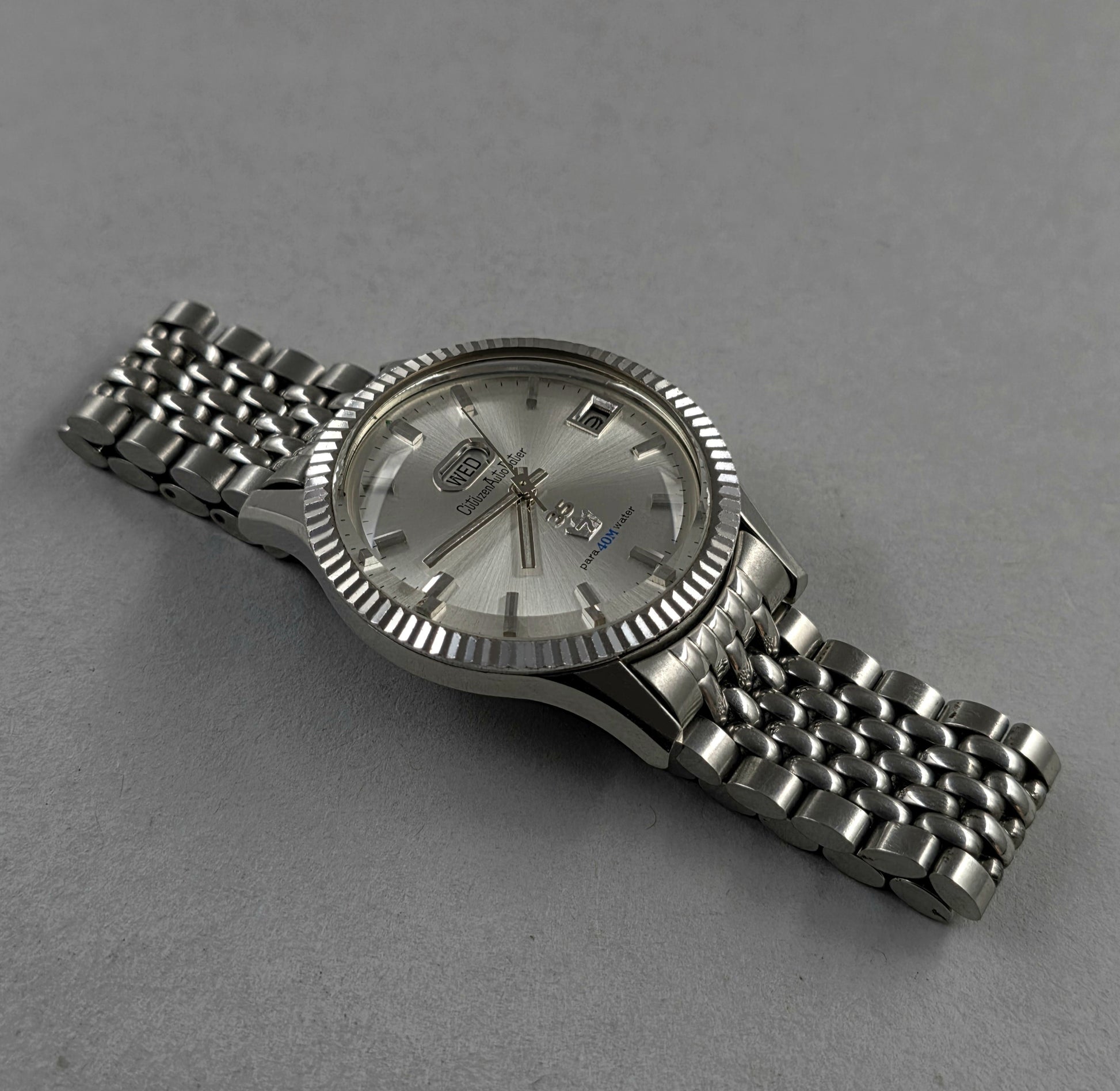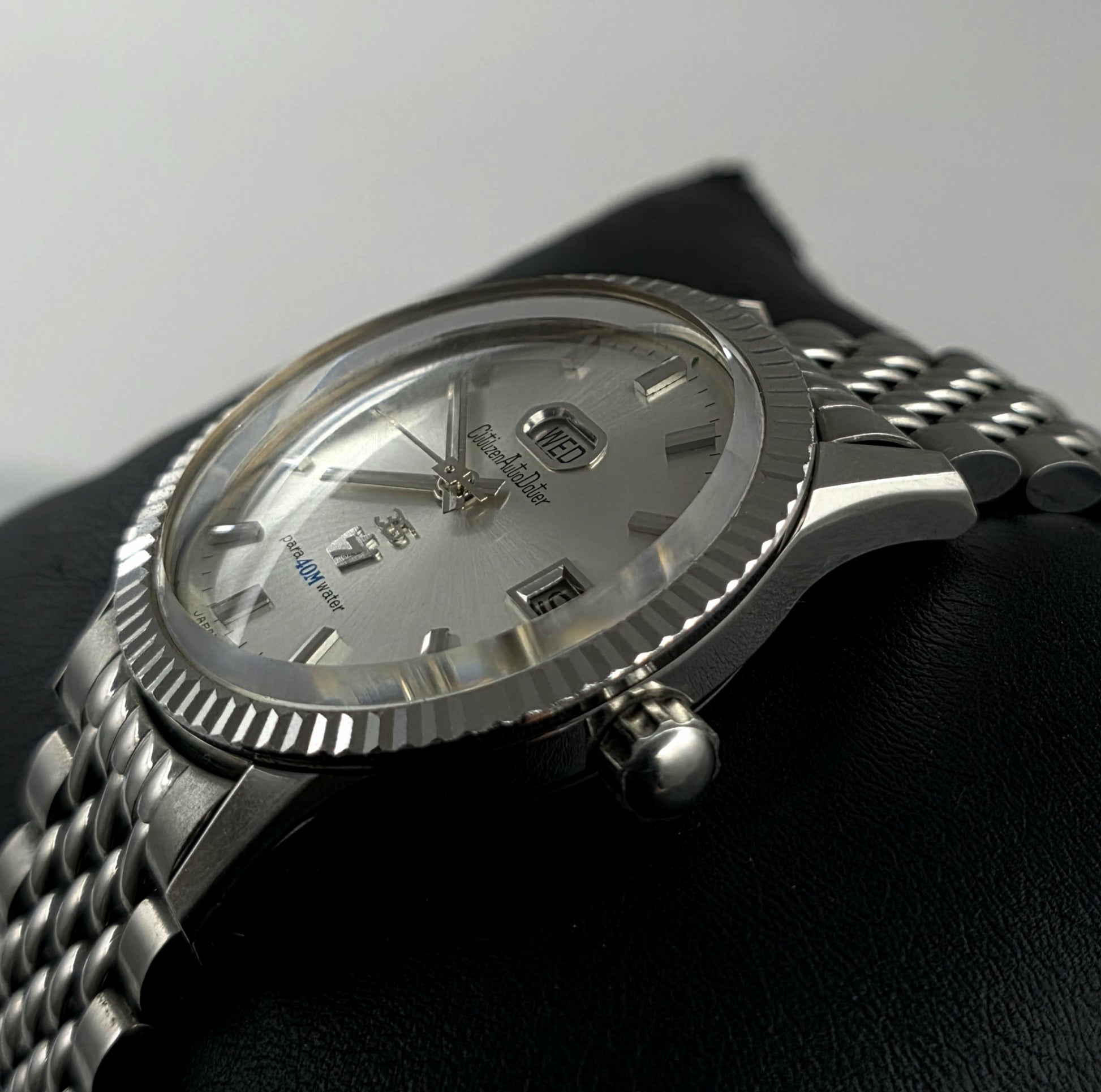 Its silver dial takes on different tones when exposed to light; sometimes appearing as a calm matte surface, other times dazzling with subtle, glossy reflections. Baton indices give the dial a regular rhythm, a testament to its fine craftsmanship. The day window at the top of the dial, combined with the date display below, offers a highly functional detail for its time. For its time, the day-date function provided great convenience to watch wearers in their daily lives, creating a significant difference that set the AutoDater apart from ordinary models.