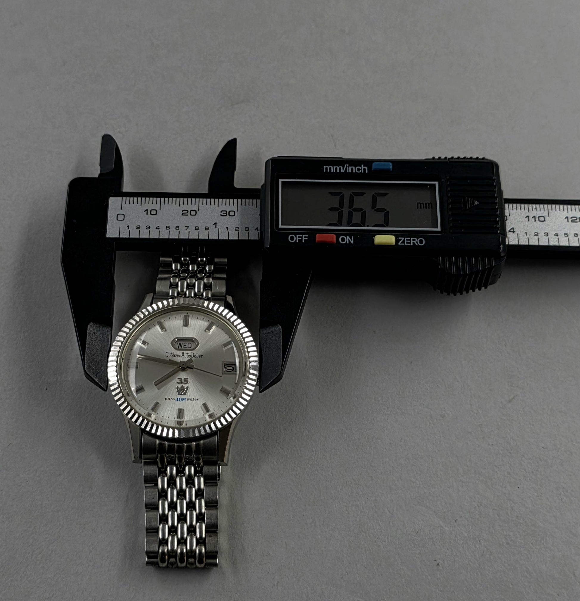 The case's diameter of approximately 36.5 mm offers a balance that is both faithful to vintage-era dimensions and meets today's expectations of comfort. The fluted bezel-style gear frame refracts light, adding movement to the watch, offering an elegance reminiscent of Rolex's iconic design lines. It creates a quiet yet powerful accent on your wrist. The stainless steel body and original Citizen bracelet are the best proof that this model has been preserved as a truly complete design.