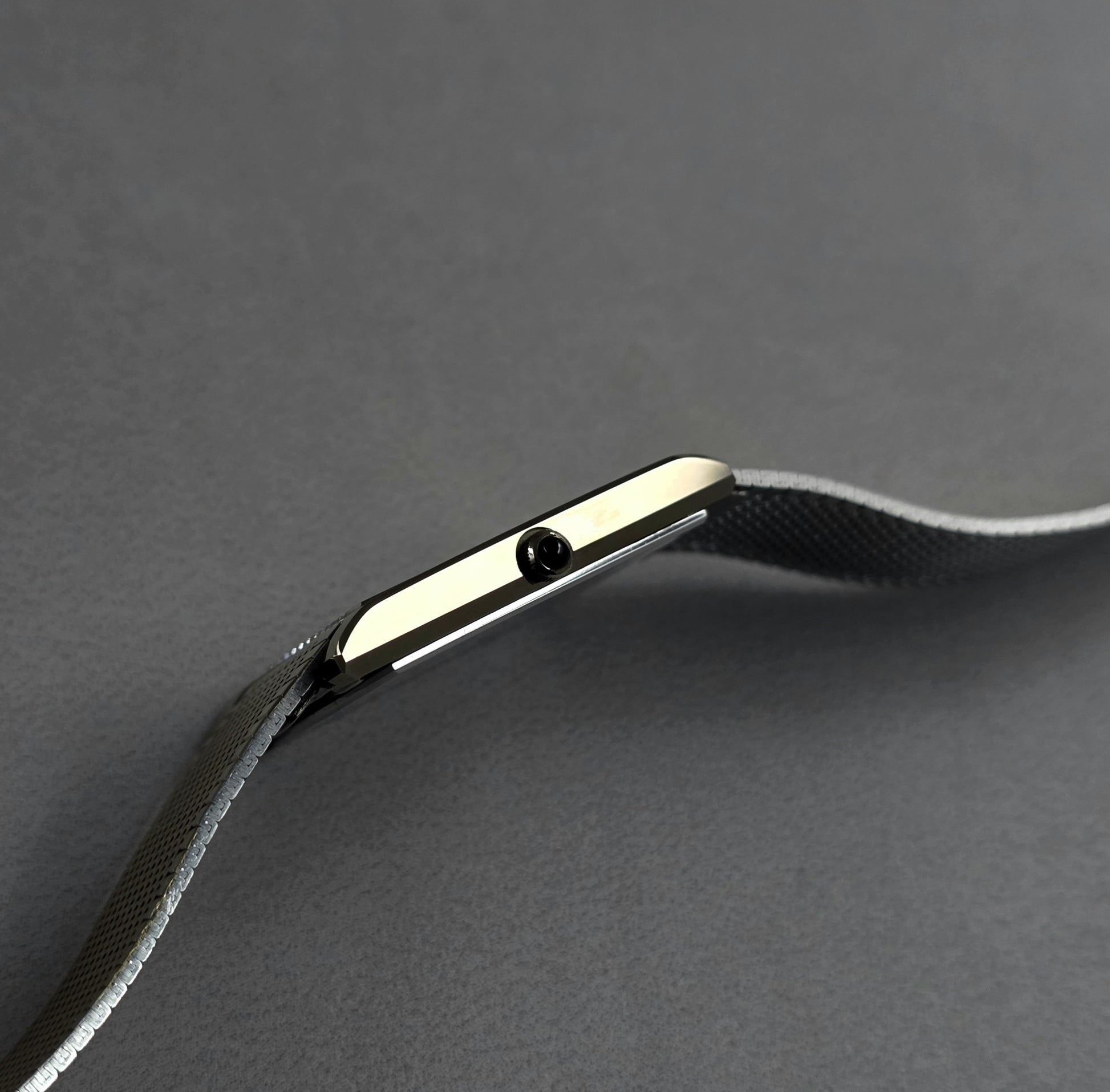 The watch has a very thin and elegant structure, in keeping with the "ultra-slim" philosophy of its time. The rectangular case, with its sharp lines and mirror-polished finish, looks like a jewel on the wrist. The case material, UHAG (Ultra Hard Alloy Gold), is much more durable and retains its shine for a long time compared to classic gold plating. The integrated mesh bracelet gently wraps around the wrist for comfortable wear, while the clasp ensures the watch is worn securely.