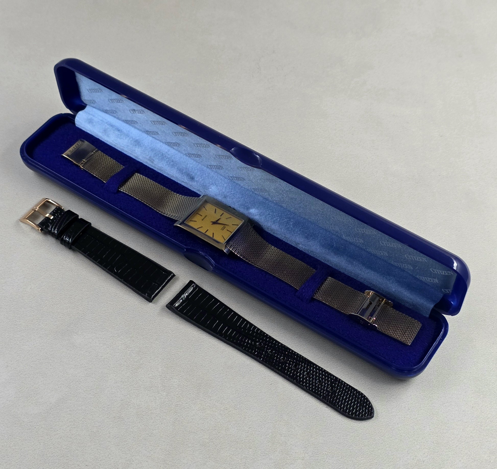 Extra: Comes as a set with its original box and a steel strap with a Citizen logo buckle and an additional black leather strap.