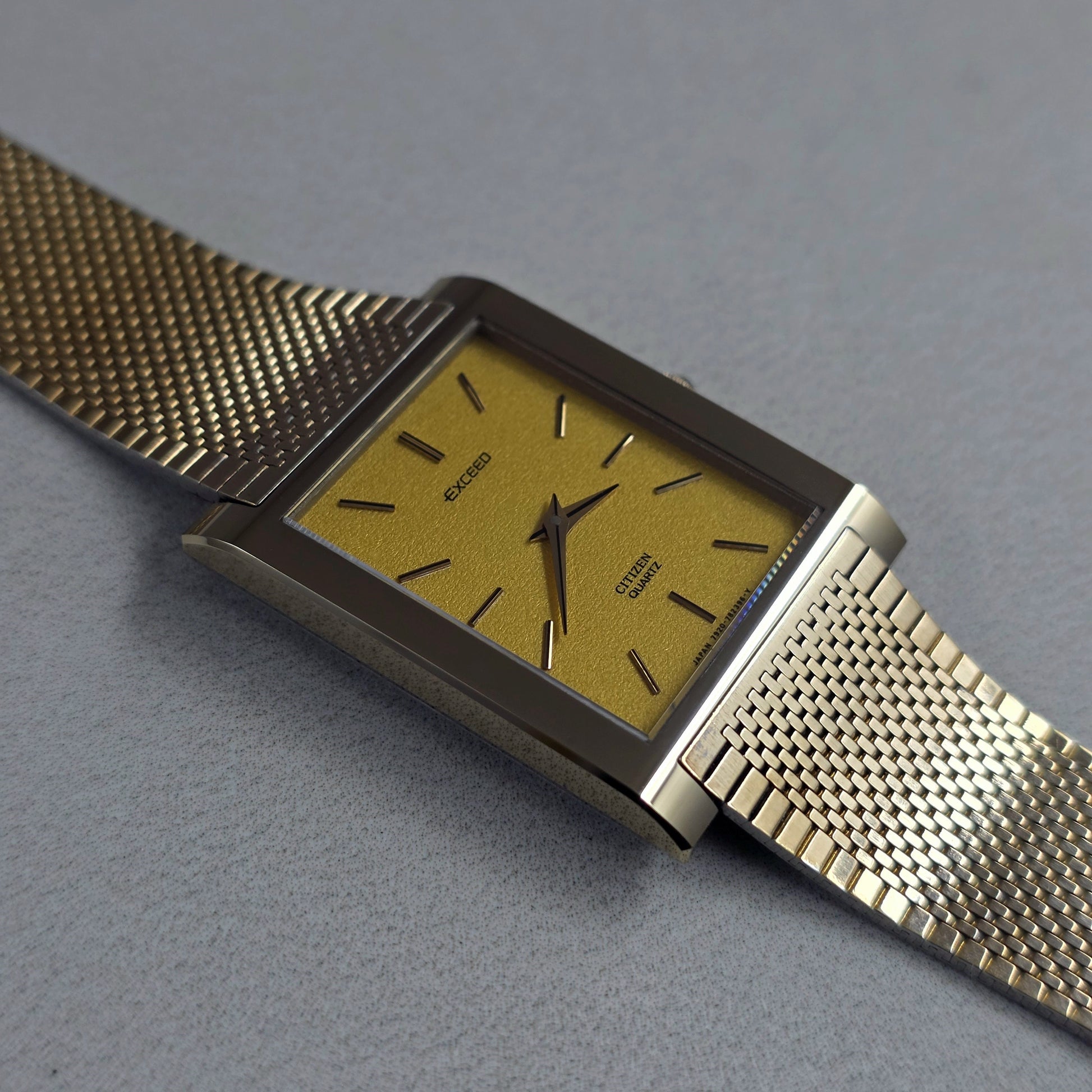 Citizen's Exceed series, representing the luxury segment, is one of the brand's most exclusive collections, combining technology and elegance. The model you are viewing, reference 4-795237 TA, perfectly reflects the high-end quartz watch aesthetic of the late 1970s and early 1980s with its tank-type rectangular case and gold-toned textured dial. The most striking feature of the watch is its UHAG case structure, an ultra-hard and polished metal alloy developed by Citizen at that time to resist scratches.
