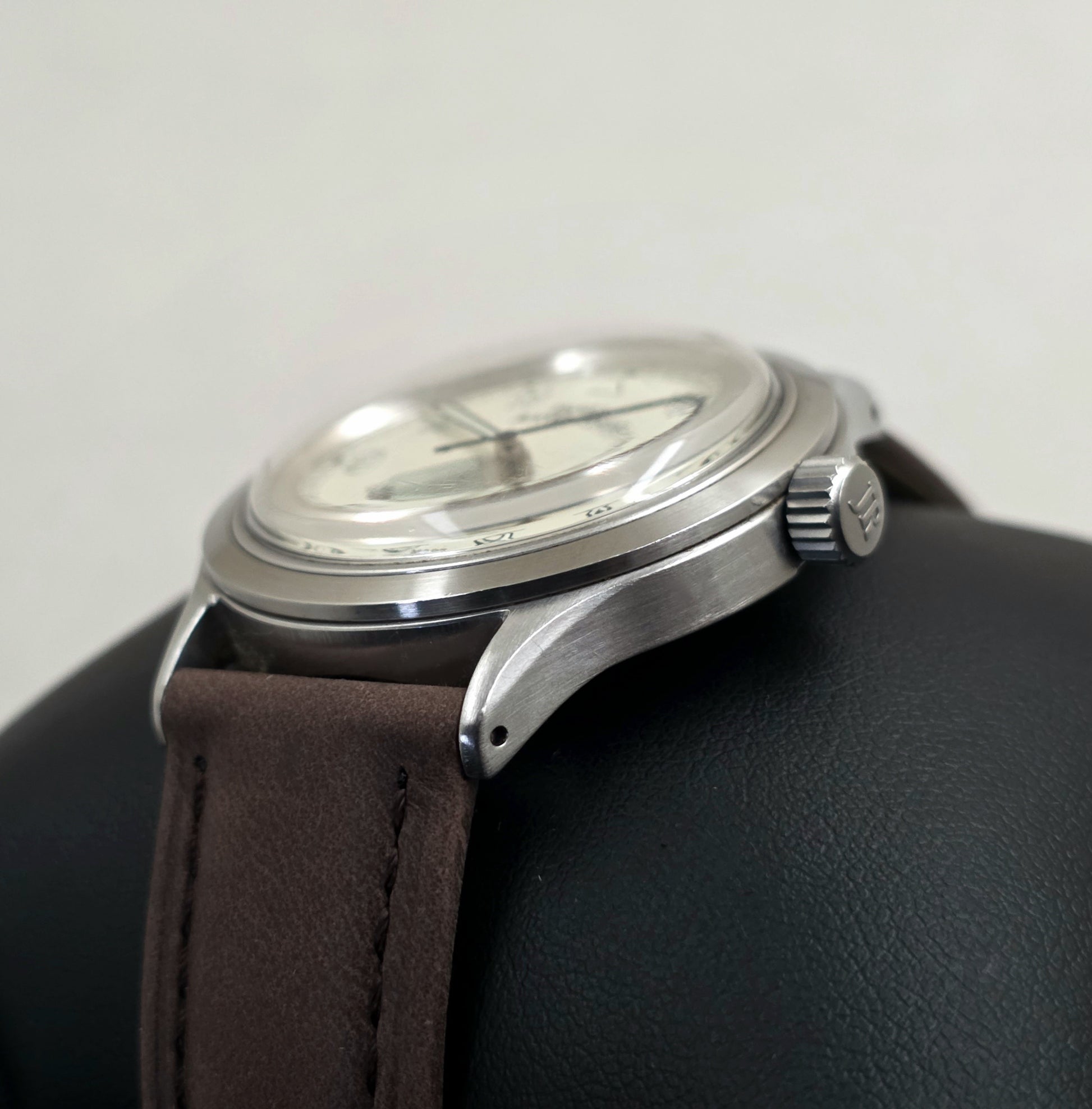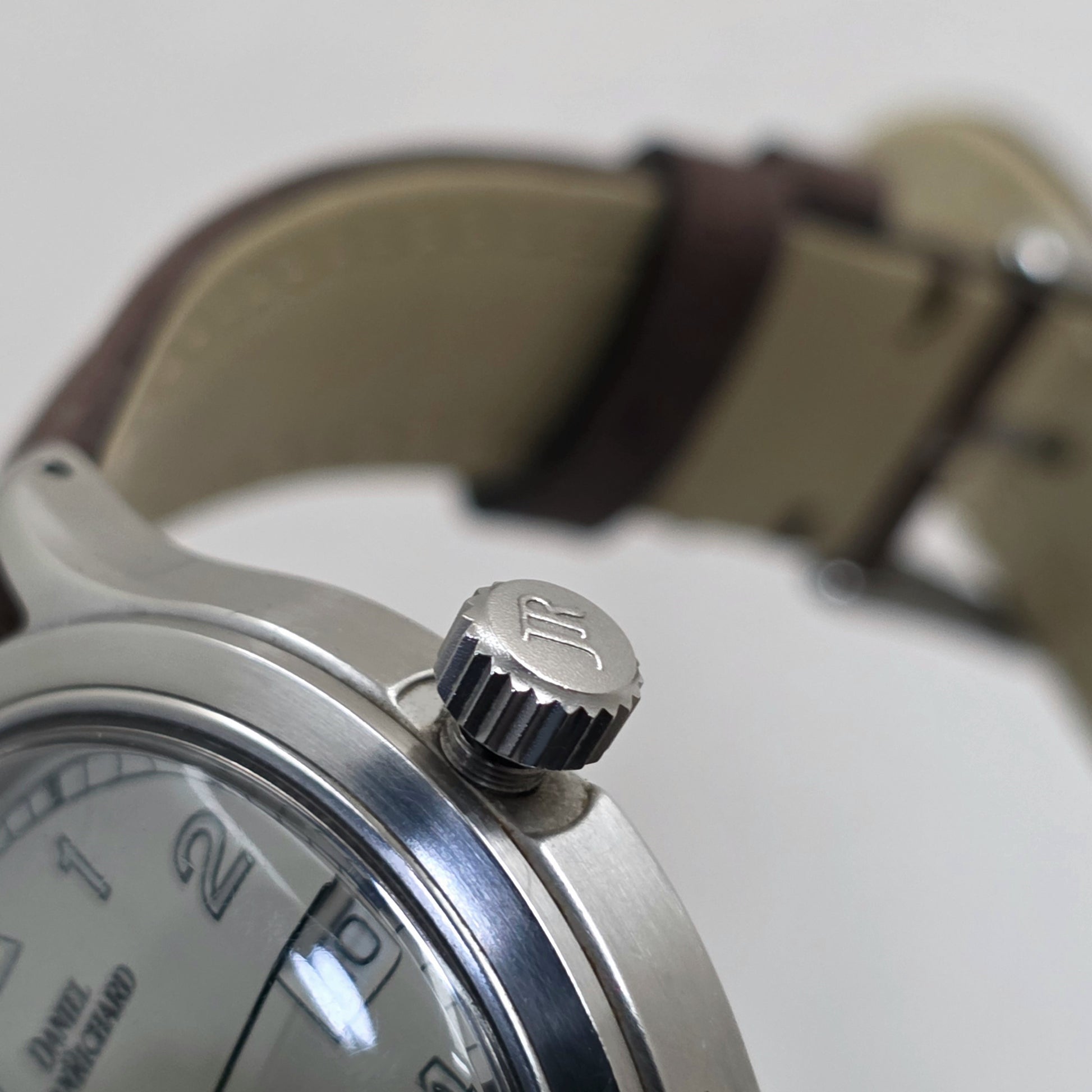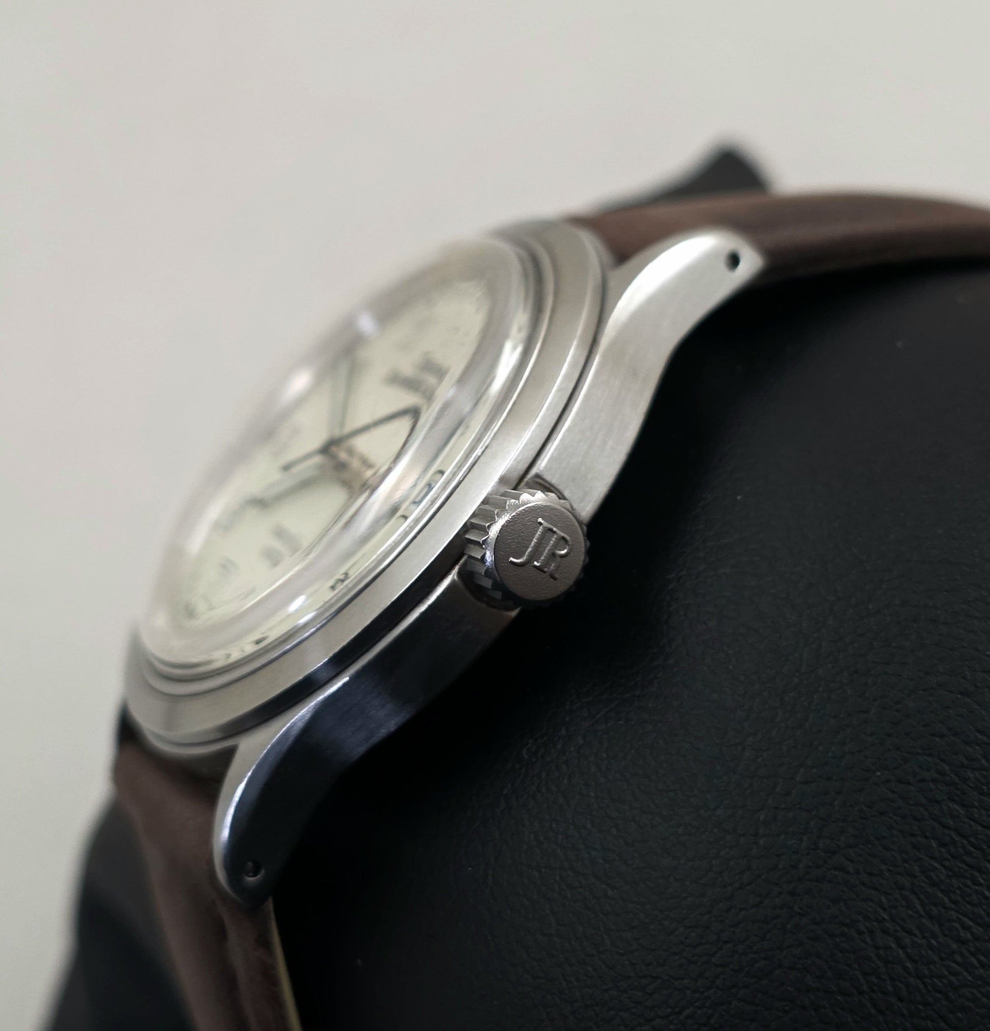 Crown: Screw-down, with "JR" engraving on the side, watertight seal