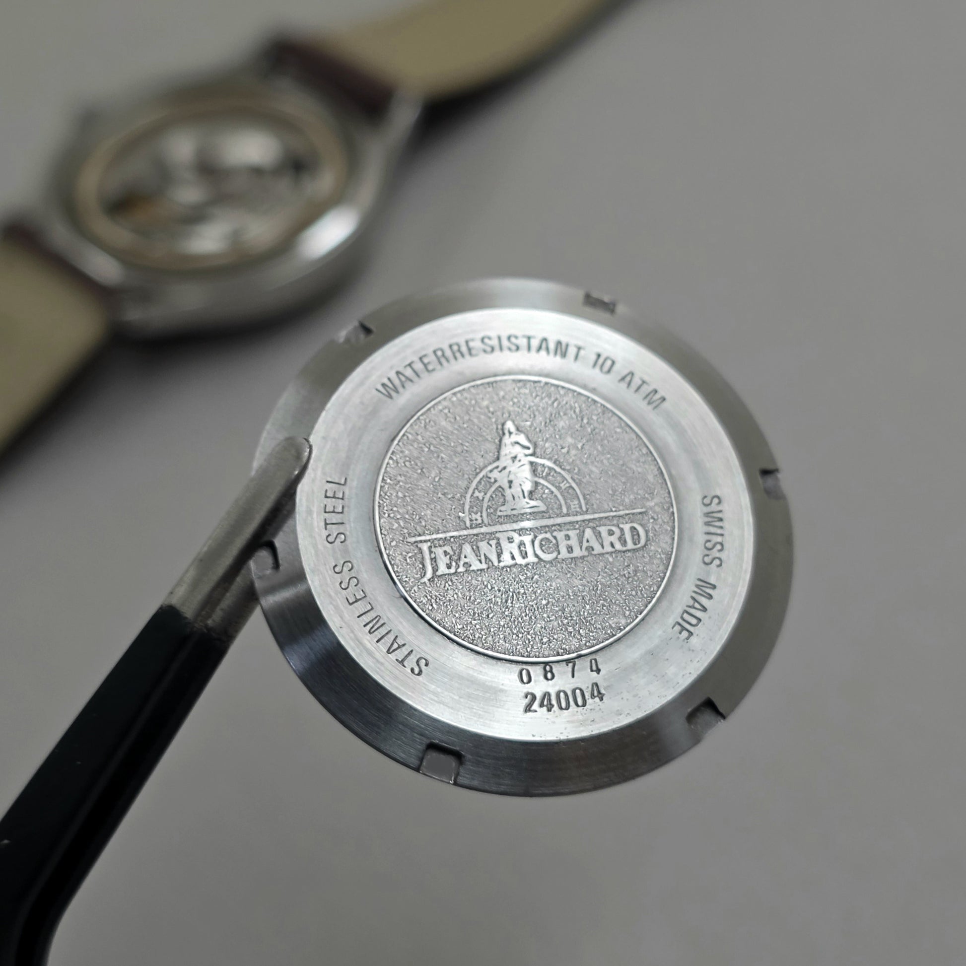 Back Cover: “JEANRICHARD - 24004 - 0874 - WATERRESISTANT 10 ATM - SWISS MADE”