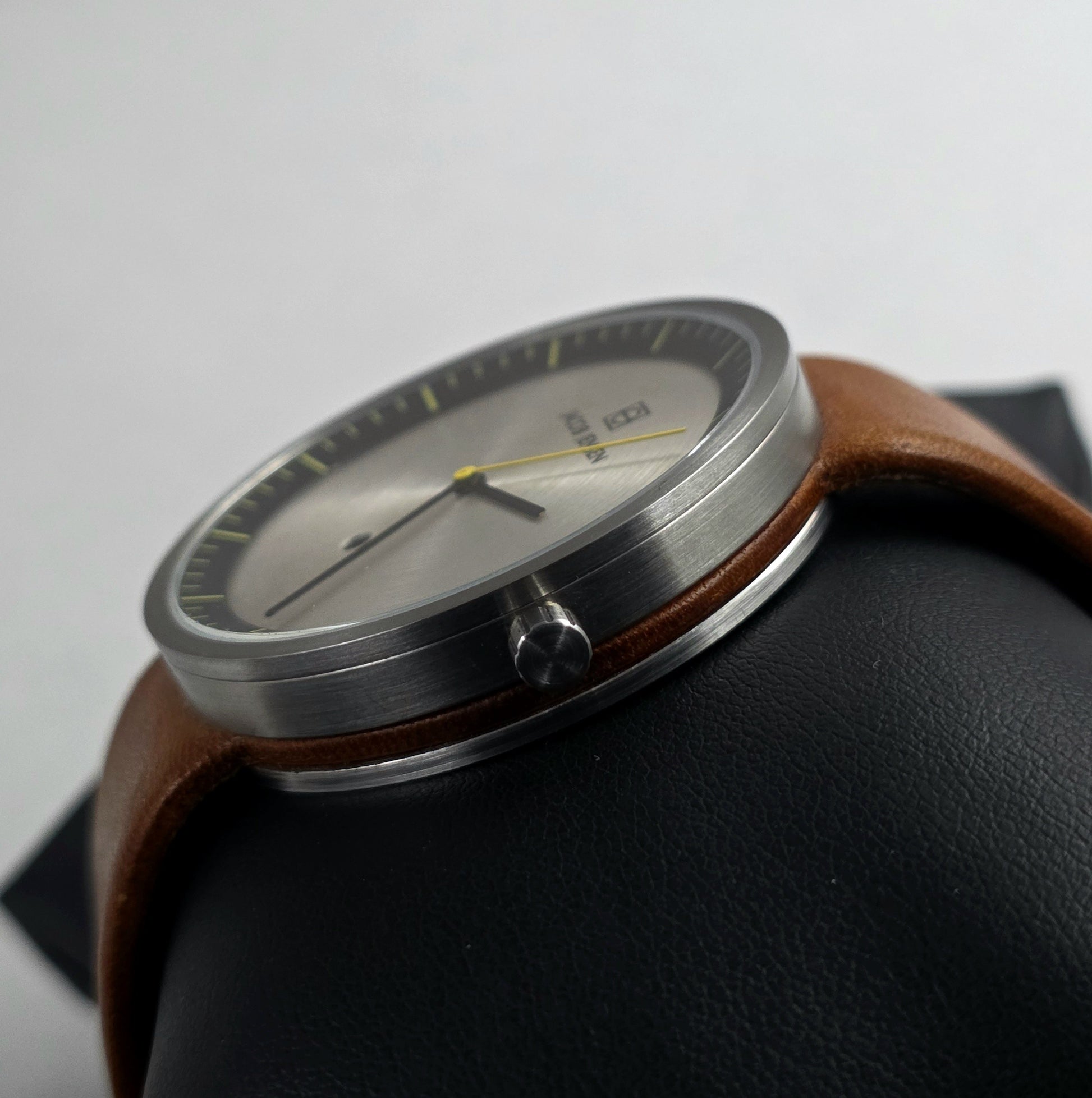 The tan-colored genuine leather strap complements the silver case and yellow details beautifully. It can be easily worn with both casual sporty-chic outfits and classic office attire. As a design-focused watch, it is an ideal choice especially for users interested in architecture and art.