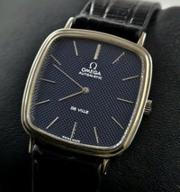 The Omega De Ville 151.0045 is a vintage men's watch produced in 1972. It has a classic cushion-shaped case with curved corners, a blue honeycomb-textured dial and an automatic caliber 711 movement. The Omega Caliber 711 is a well-known movement with 24 jewels, a 19800 bph beat and a 42-hour power reserve. The Omega Deville 151.0045 model is a sought-after model among Swiss watch collectors with its unique stylish design and high-quality construction.
