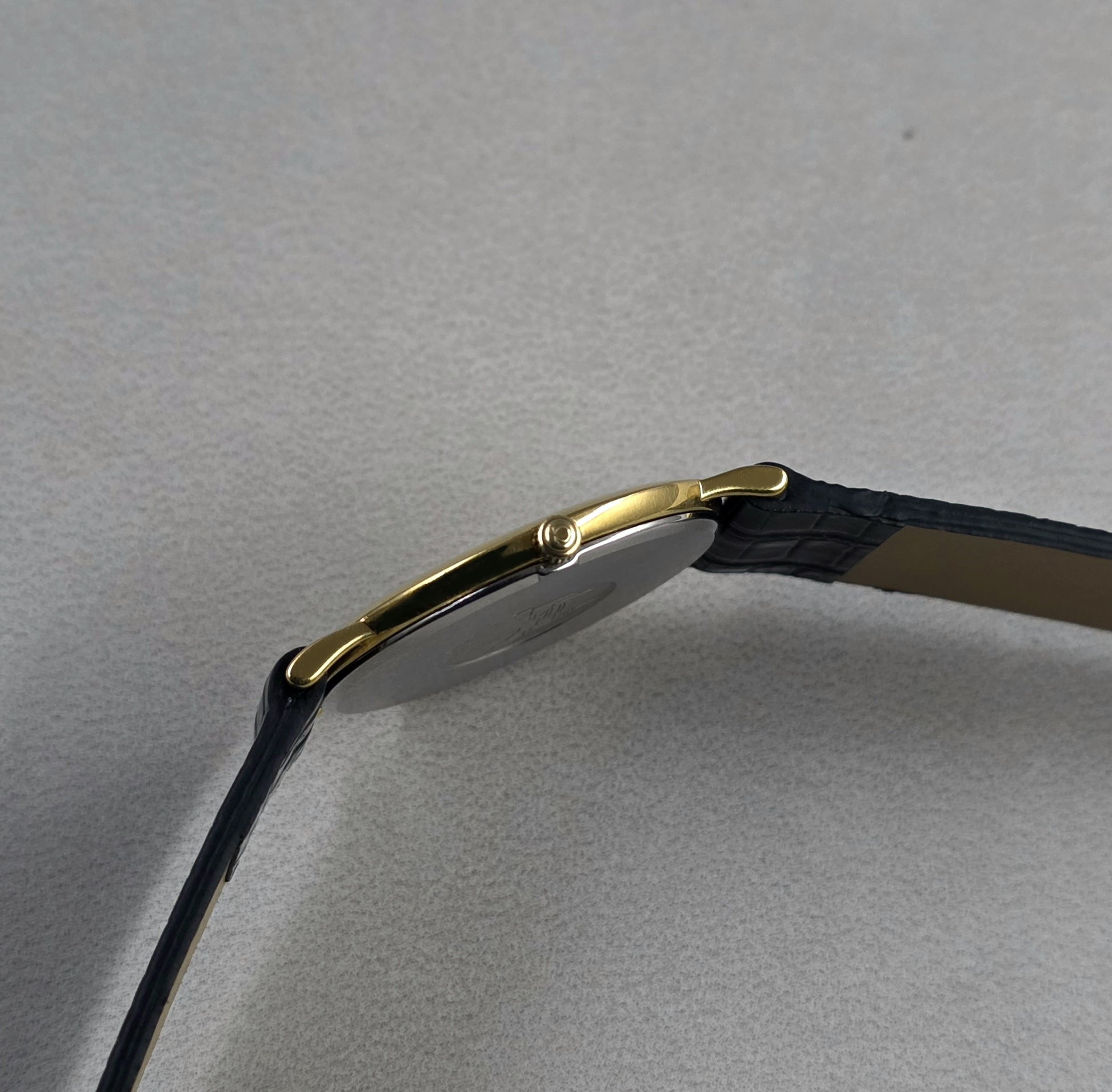The watch's 20-micron gold-plated (Plaqué Or G 20 Microns) case is designed in accordance with the slim profile fashion of the era. The minimalist lug structure and elegant lines make the watch almost imperceptible on the wrist. The iconic "De Ville Quartz" city skyline engraving on the case back symbolizes the model's originality and the spirit of the period. This slim structure, reflecting the aesthetic of 1984, offers a flawless wearing experience that glides seamlessly under the cuff.