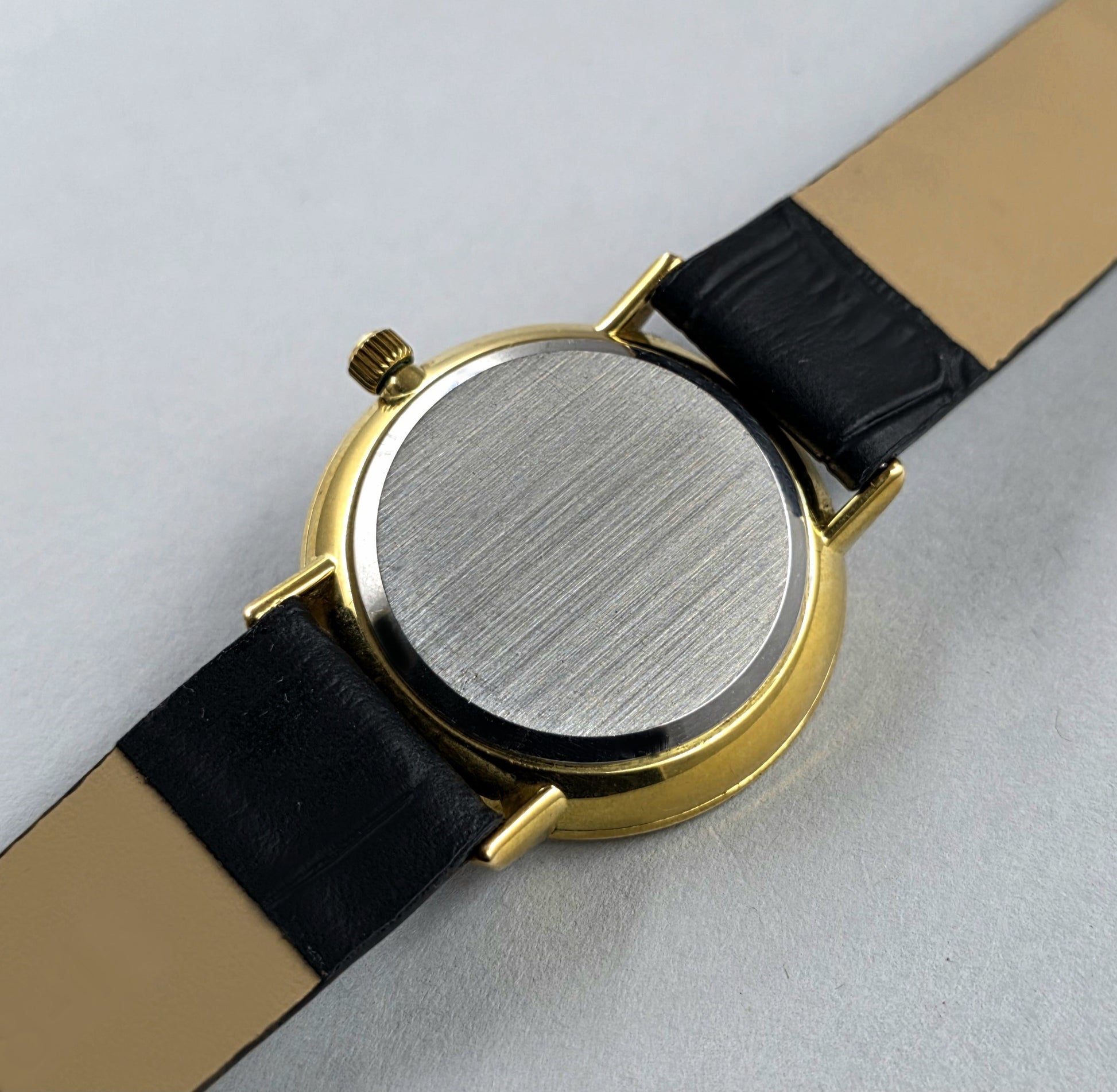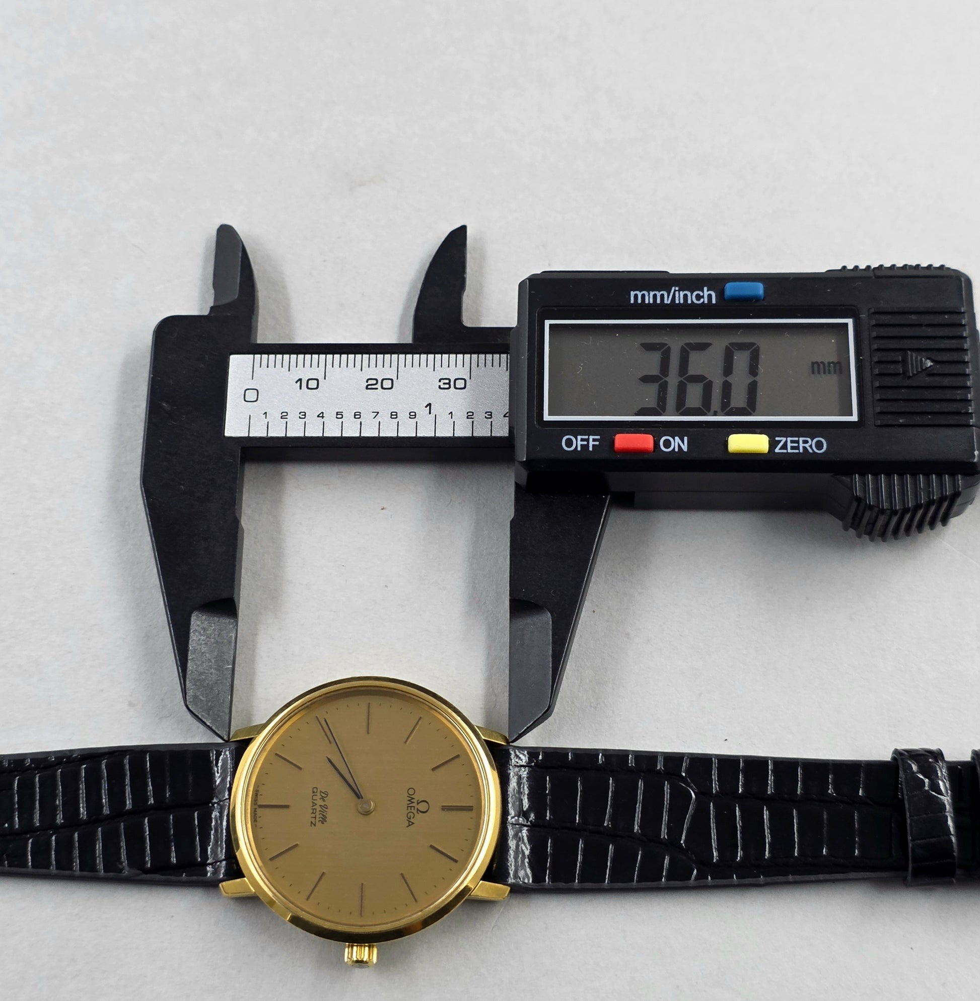 The De Ville was a special collection offered by Omega to customers who preferred an urban and classic style. This design, particularly combined with the gold-plated case, baton indices, and black leather strap, remains a symbol of timeless elegance.