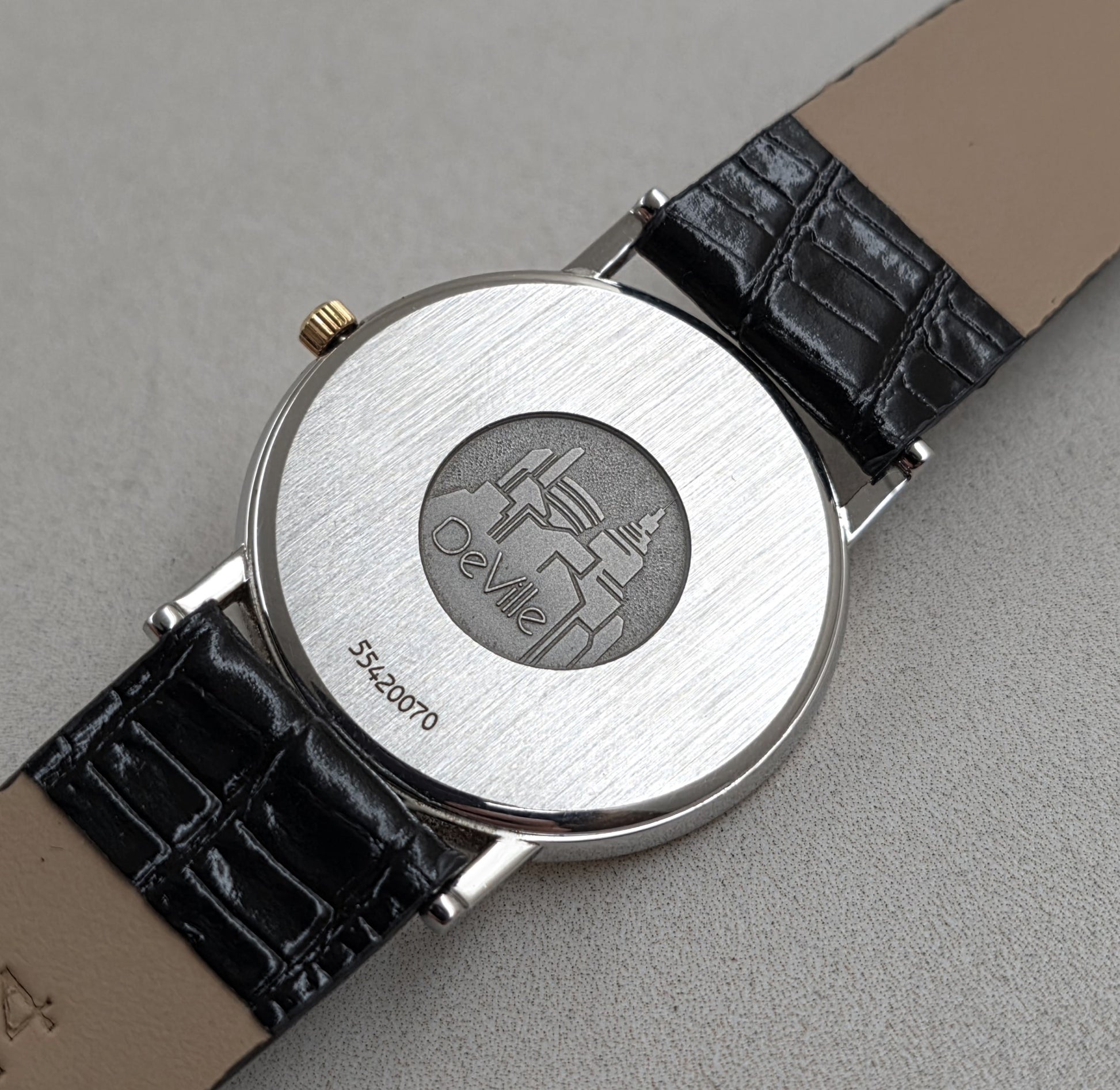 The minimalist "De Ville" lettering on the dial preserves the typographic elegance of the period – timeless, clean, and balanced.