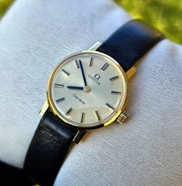 It has a 17-jewel, hand-wound caliber 625 movement and a 42-hour power reserve. It has a heavily gold-filled stainless steel case, a beautiful gold dial with black hour markers and hands, and a black leather strap.