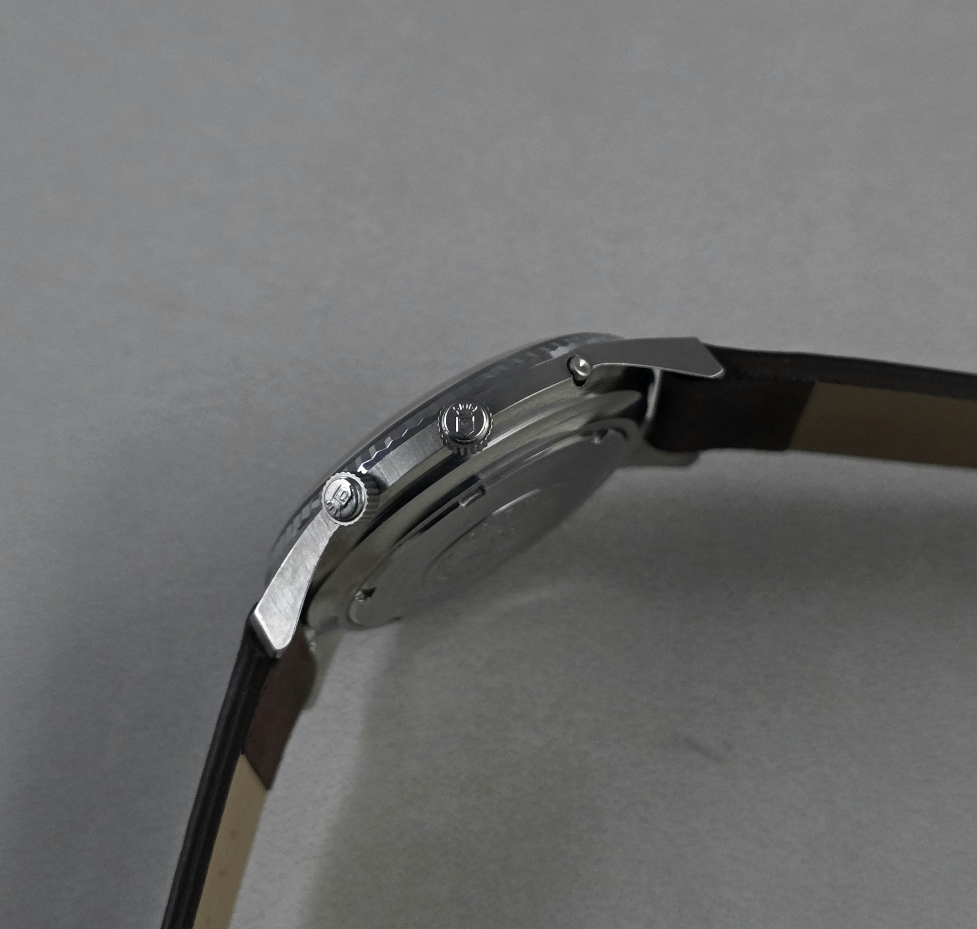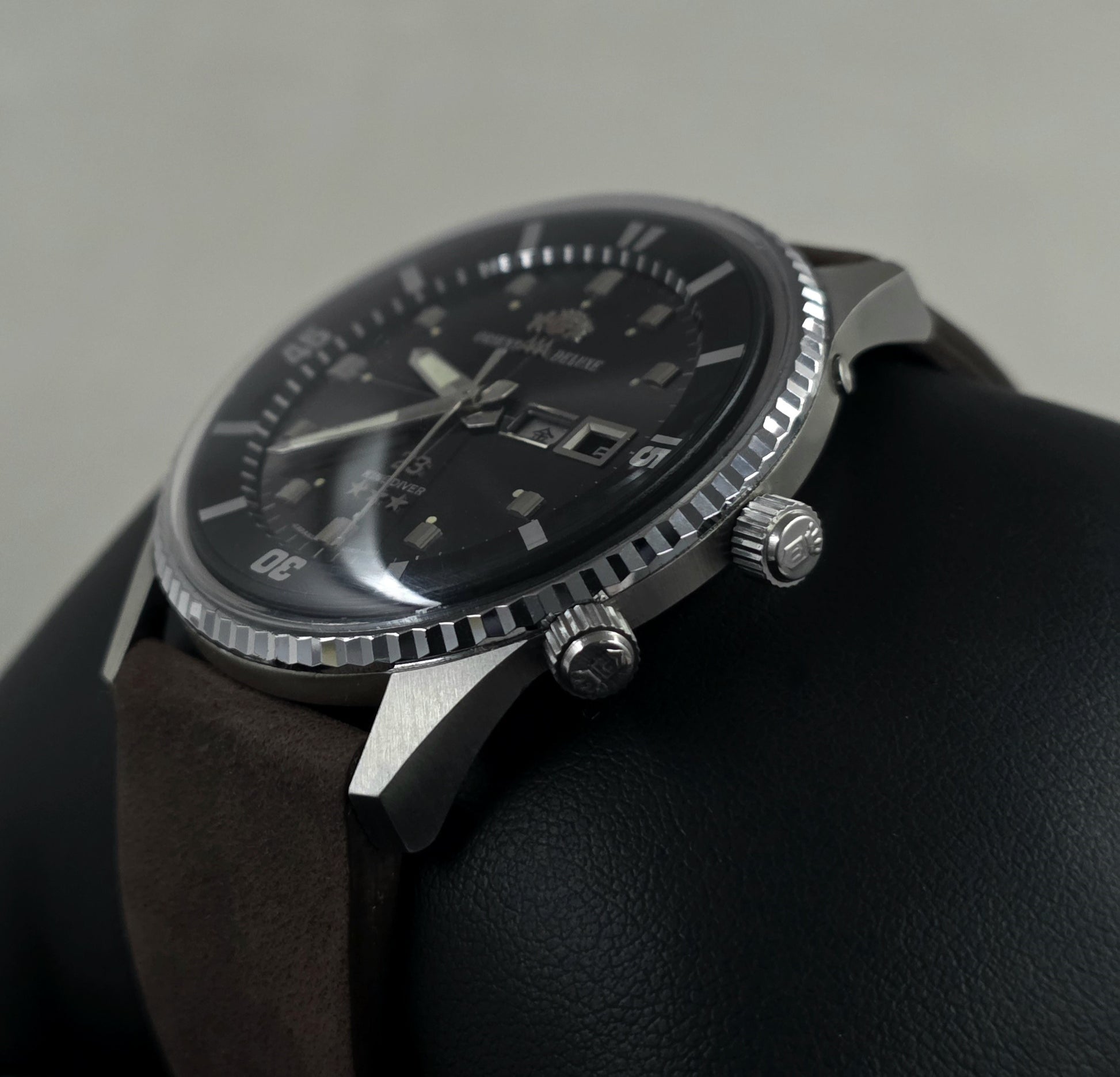 The watch features a revolutionary 42 mm diameter case made of stainless steel, quite masculine for its time. The three-button mechanism on the right side of the case is the control center of the watch: the button at 2 o'clock is used for day setting, the crown at 3 o'clock for time setting, and the crown at 4 o'clock for moving the inner rotating bezel. Despite such a large case, thanks to the ergonomics of the lug structure, it offers a very balanced and assertive look on the wrist.