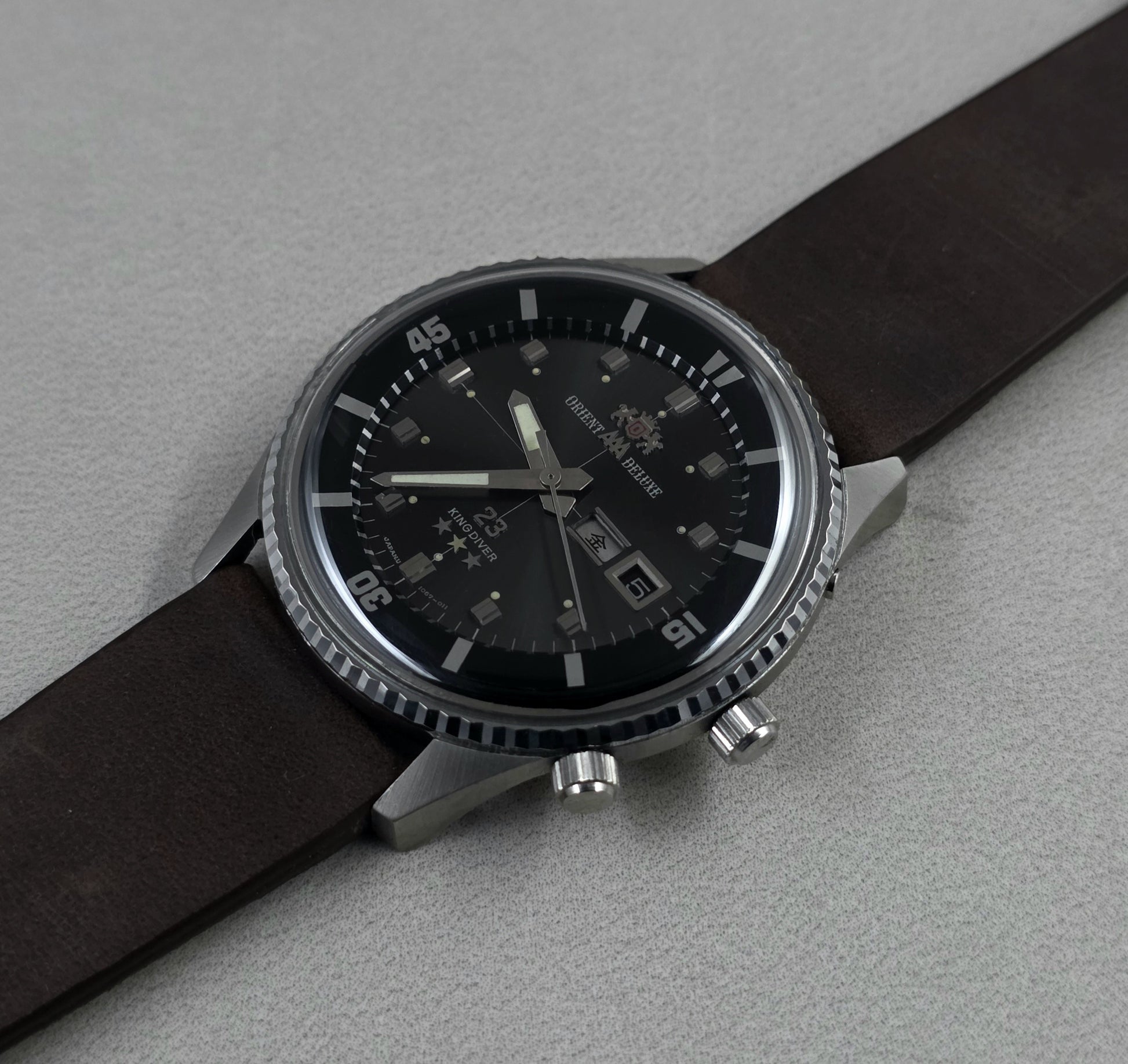 One of the most charismatic and imposing vintage pieces of Japanese watchmaking is the Orient King Diver Deluxe. This model is not one of the popular re-issue versions of today; it is a completely original vintage piece carrying the spirit of Orient from the late 1960s and early 1970s. With its large case and multi-functional dial, living up to its "King Diver" name, it is a "Super Compressor" style diving watch with high collectible value.