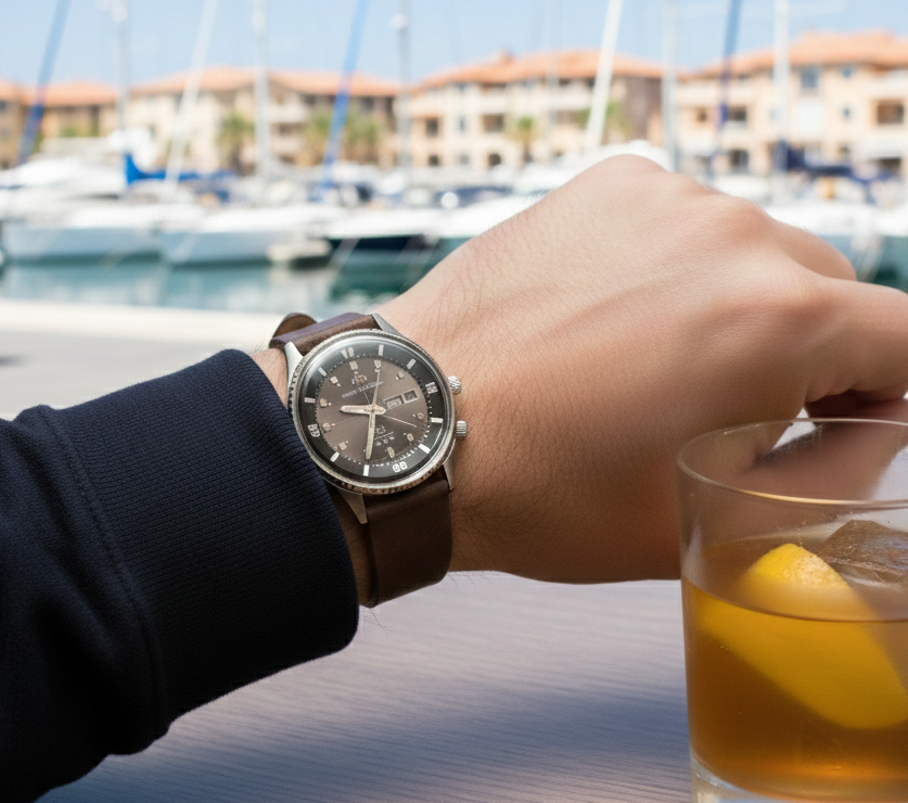 The Vintage King Diver elevates the "tool-watch" aesthetic, especially when paired with brown nubuck or leather straps. Its large size ensures it perfectly meets modern watch standards. It creates a stunning visual harmony with linen shirts in a seaside town and with leather jackets in everyday city life.