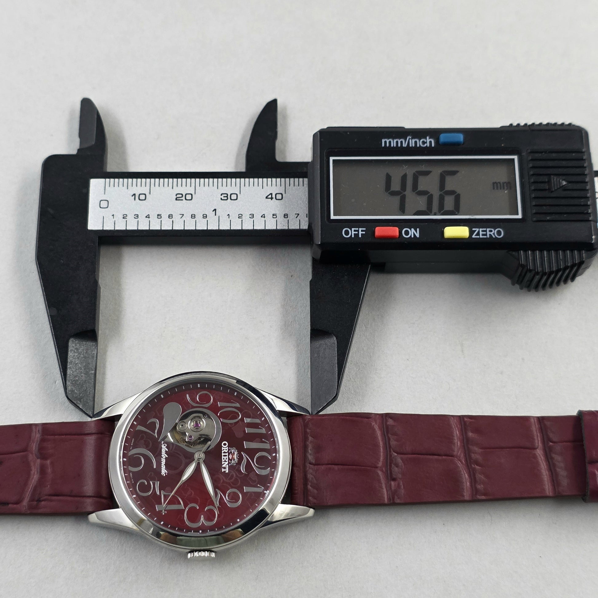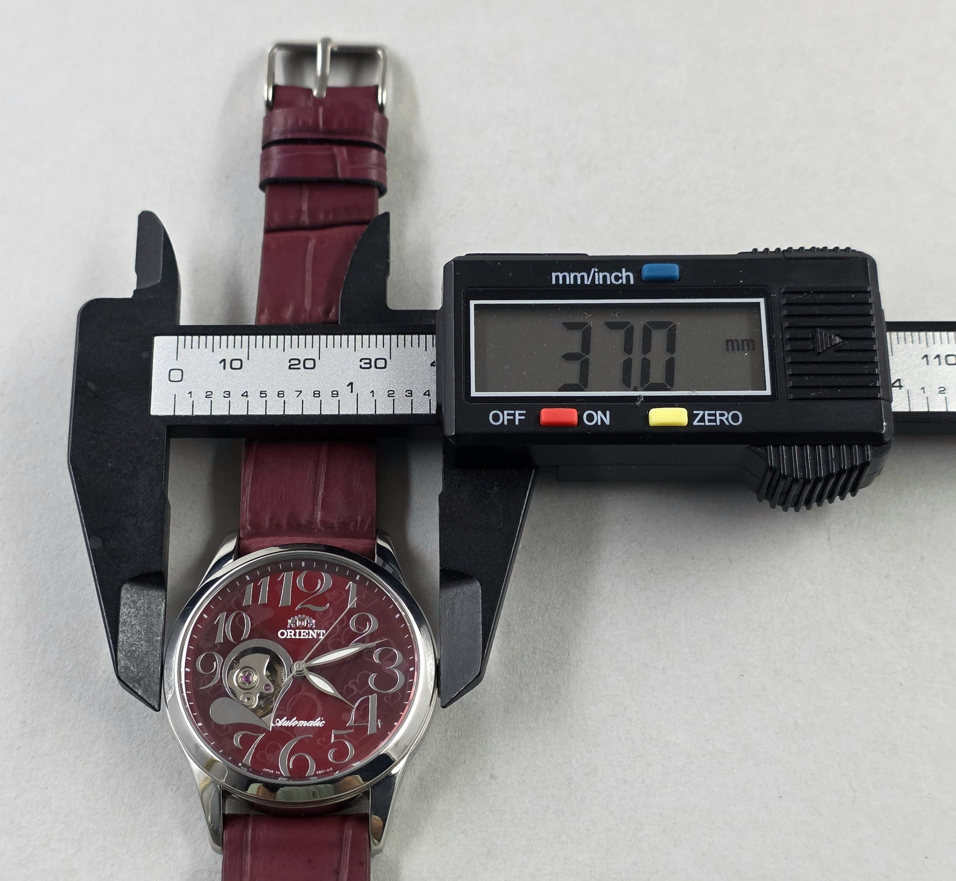 The approximately 37 mm stainless steel case offers elegant wear for both men and women. The burgundy leather strap blends seamlessly with the dial.
