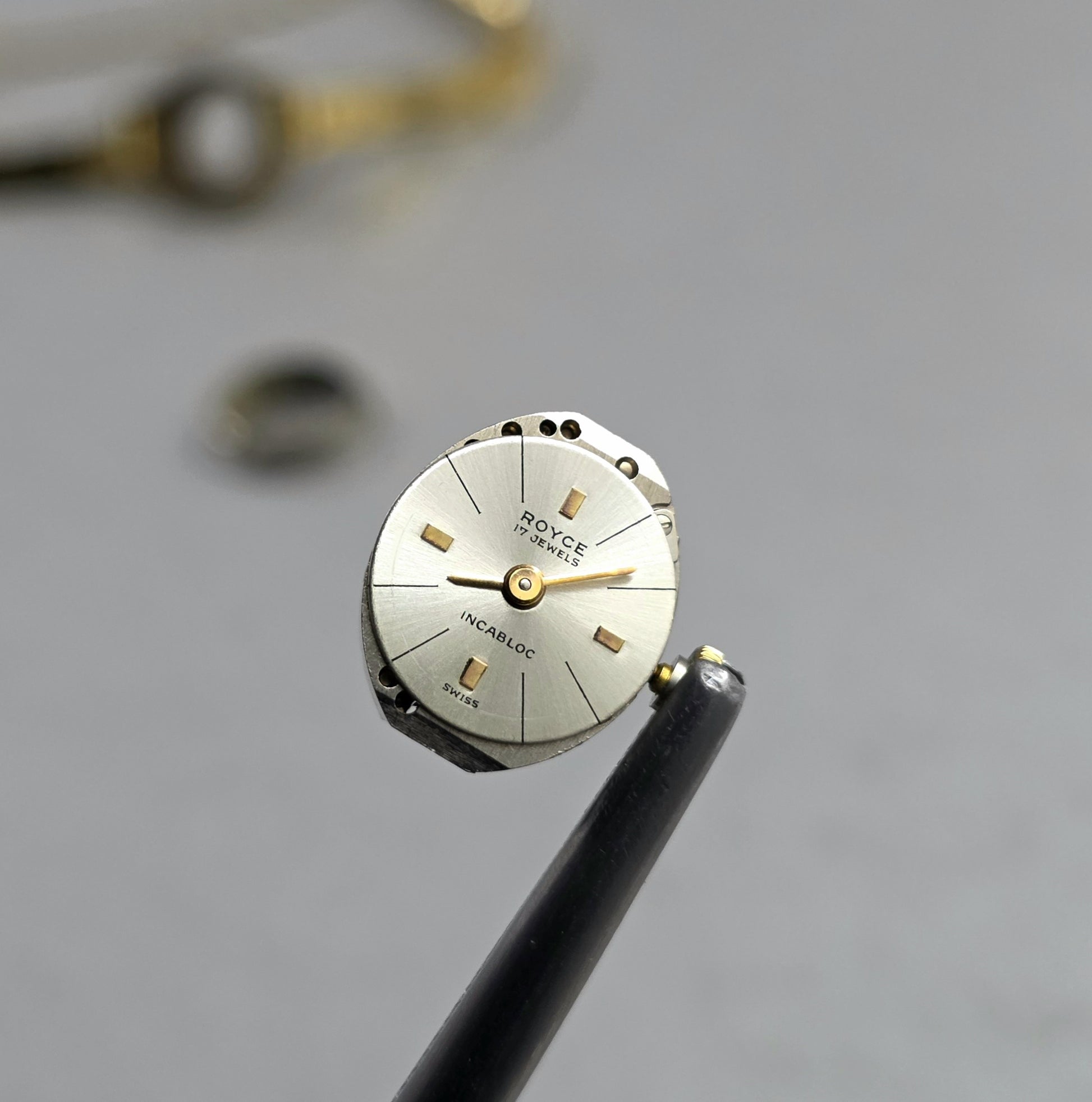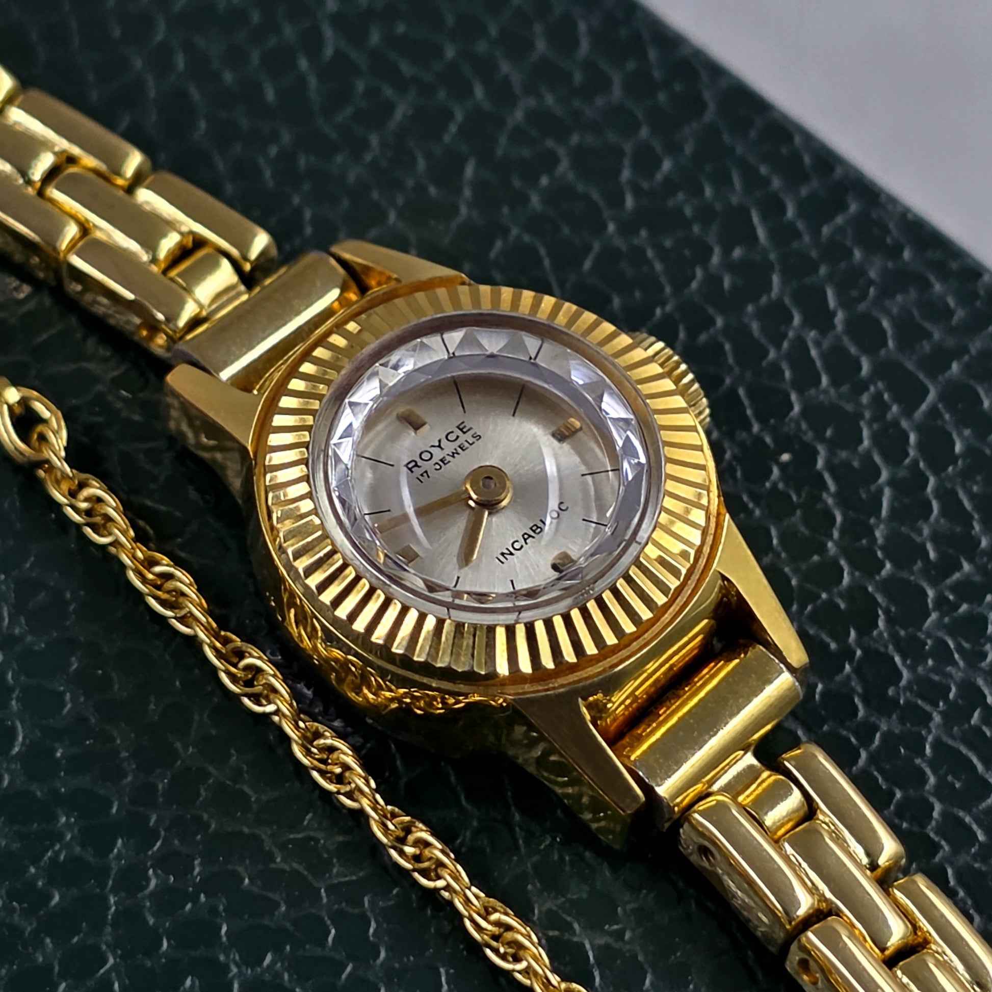 The silver-colored "sunburst" dial, with its slight patina from years of wear, enhances its vintage character. The gold-toned baton indices and minimalist hands on the dial combine readability with aesthetics. The "Royce 17 Jewels" inscription at 12 o'clock and "Incabloc" at 6 o'clock emphasize both the prestige and durability of the watch.