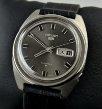The Seiko 5 6119-8250 is an automatic men's watch with a date and day display. Part of the Seiko 5 collection, which was first released in the late 1960s, the watch features a stainless steel case, a dark gray dial, and a leather strap. It also features a 21-jewel 6119 movement and a 42-hour power reserve. The Seiko 5 6119-8250 is a classic vintage watch that is perfect for everyday wear. It is stylish, reliable, and sturdy, making it a great choice for watch collectors of all levels. The model you are reviewing was produced in 1968.