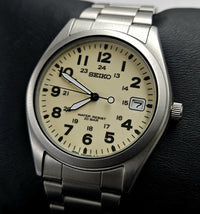 The Seiko 7N42-8260 is a military-style quartz watch manufactured from 1983 to 1993. It is known for its simple design, robust construction, and excellent readability. The dial of this product is fully phosphorescent, making it easy to read at night, even in the slightest light source. The body structure and steel bracelet of the product have a matte finish, which definitely prevents the watch from scratching easily and from becoming shiny. The product you are viewing was manufactured in 1989.