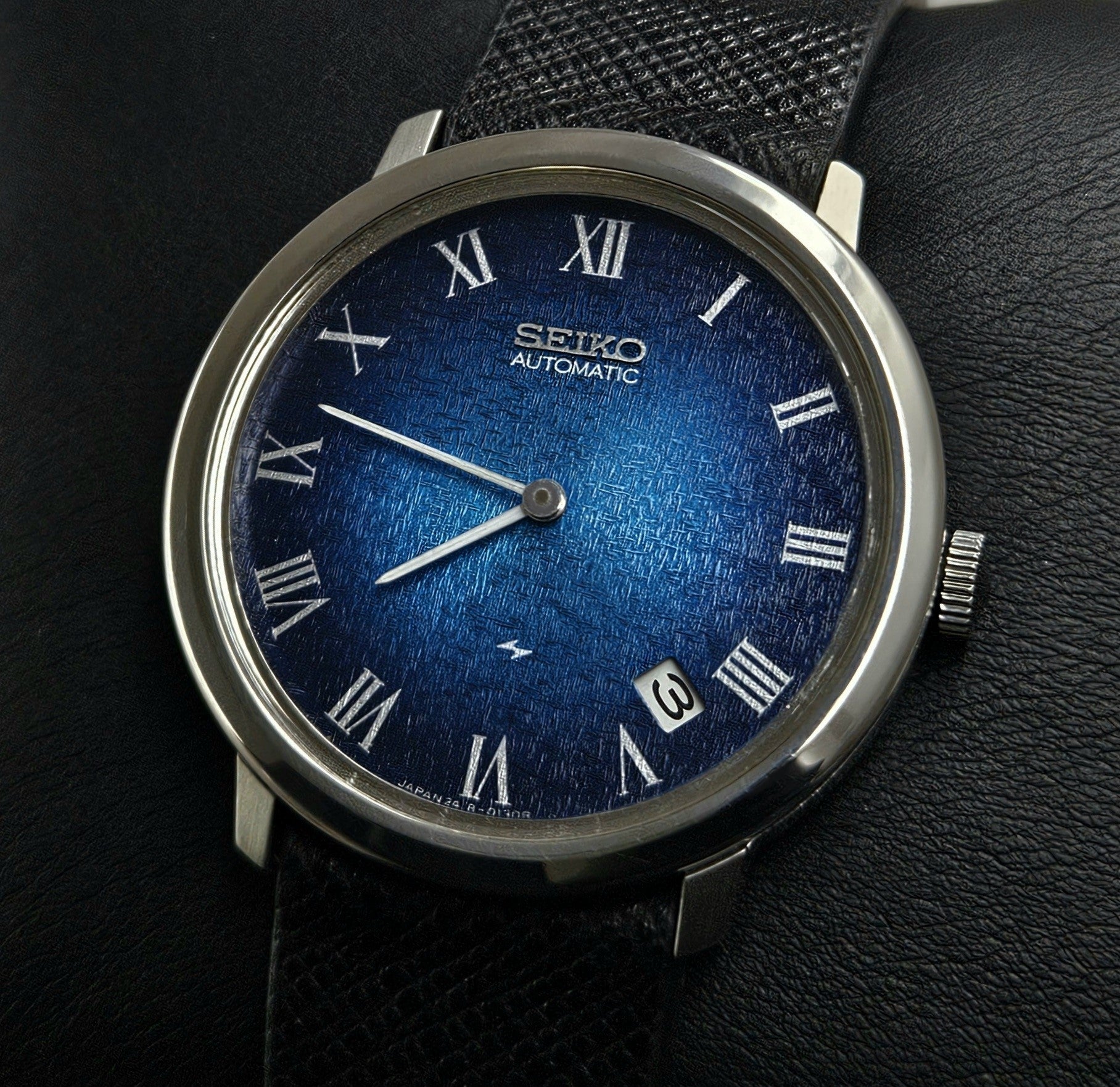 This special model, produced by Seiko in the 1970s, is a watch that not only measures time but also adds character to your style. With its deep blue textured dial and elegant design engraved with Roman numerals, the 2418-0020 is like a classic painting brought to the wrist.