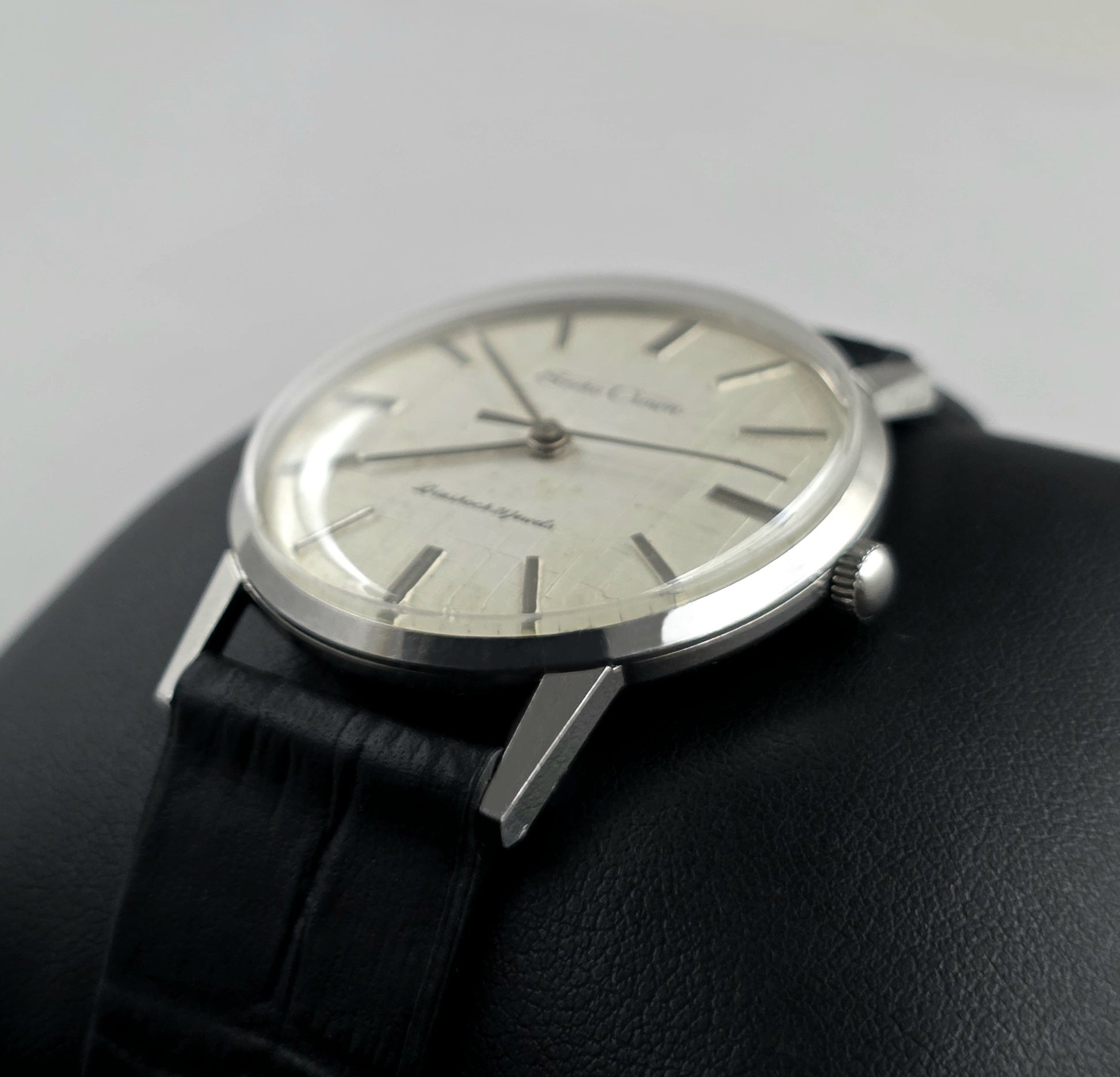 The stainless steel case offers elegance with its slim profile, while the unique cross-patterned (linen texture) surface on the dial gives the watch a characteristic depth. The thin baton indices and hands enhance legibility and emphasize the modern lines of the era. Its diameter of approximately 35 mm is the ideal size for the 1960s, offering a remarkably elegant look on the wrist.