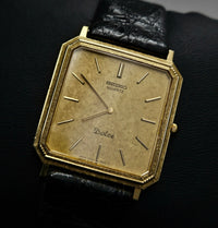 It has an exquisitely crafted case made of 10k Gold, a gold-tone dial with gold-plated hands and markers, and a black leather strap. The watch is powered by Seiko caliber 6730 quartz movement. The Dolce series is known for its slim and elegant designs, and the 6730-5160 is no exception. The case is only 27.3mm wide and 3.5mm thick, making it a very comfortable watch to carry. (You'll almost forget you have a watch on your wrist.)