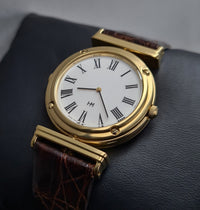 The Seiko 2N20-0070 Hanae Mori Reverso Style is a vintage collaboration watch between Seiko and Japanese fashion designer Hanae Mori. The watch features a reversible design with two different faces, a gold-tone case, and a black leather strap. This product has a great design that shares similar features with the Jaeger-LeCoultre Reverso model and allows it to be used separately on each side. It has a white-toned dial with Roman numerals on one side, while the other side has a black dial with segmented sections. The case of the watch is made of stainless steel with a heavy gold coating, giving the watch a luxurious and elegant look. This product is a quartz watch with two separate mechanisms that work with a battery. The watch you are reviewing was produced in 1988 and is suitable for unisex use with its average sizes.