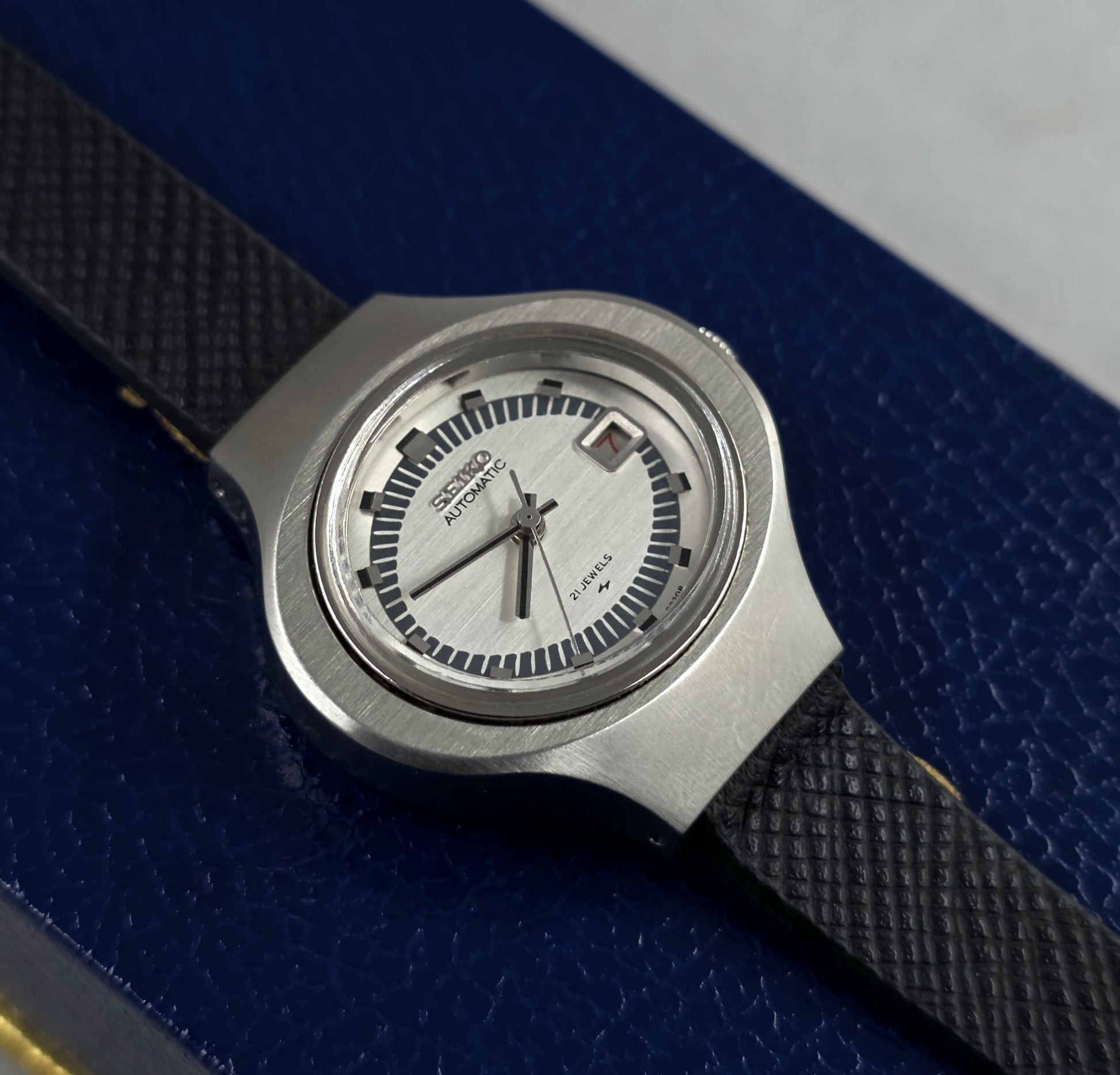 Signatures: The clearly visible "SEIKO AUTOMATIC" inscription on the dial and the iconic lightning bolt logo of the Daini Seikosha factory at the 6 o'clock position attest to the watch's authenticity.