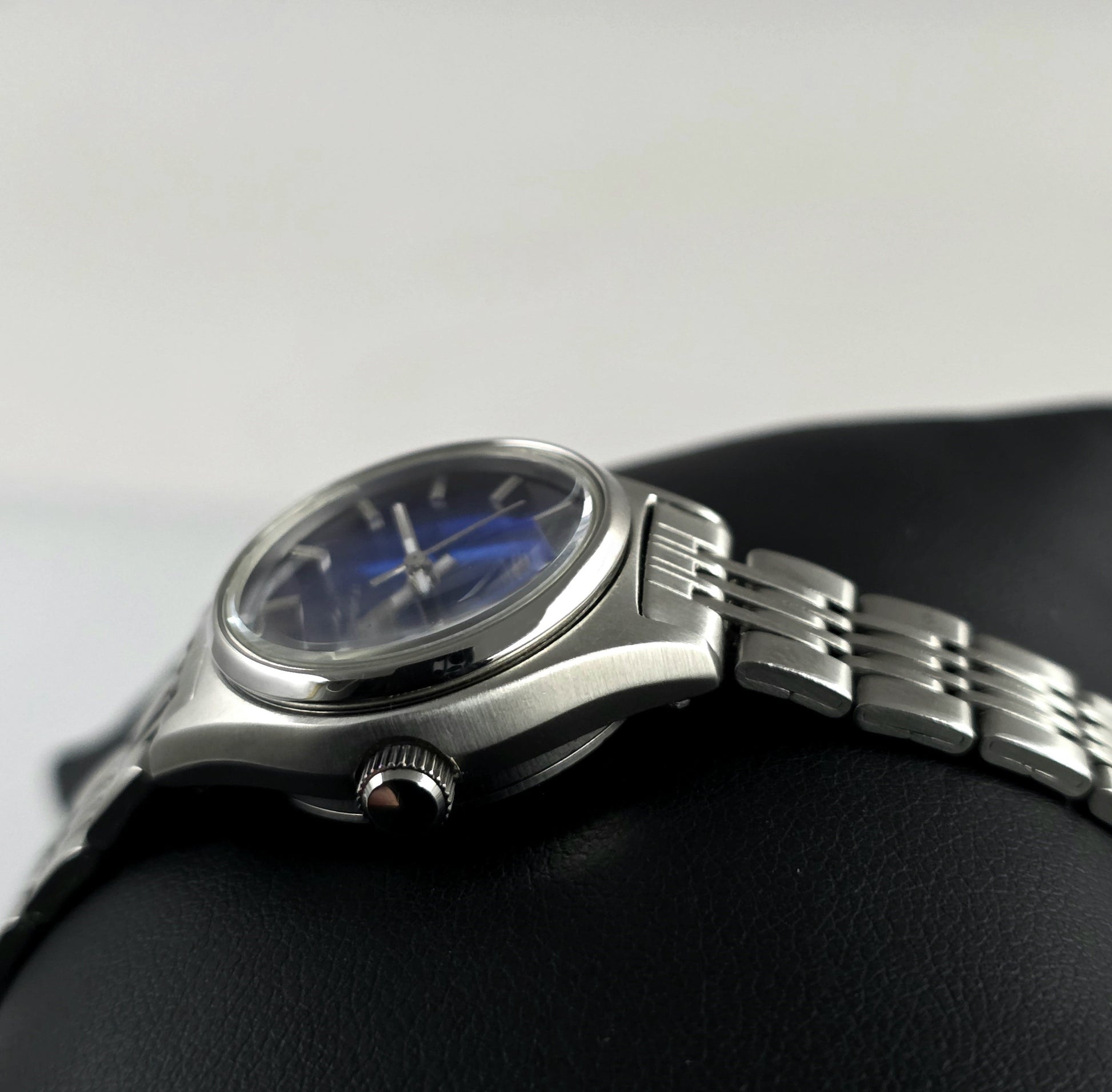 The heart of this watch is its deep sapphire blue dial with its stunning patterns. The sunburst texture and micro-patterns on the dial offer a different visual feast at every angle of light. The dial, in extremely high condition, features silver-toned indices and hands that create a perfect contrast. This pristine surface, free from any flaws, is the greatest testament to the care taken in maintaining the watch's condition.