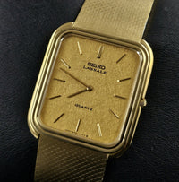 The Seiko Lassale series was a collection of Seiko’s thinner, more elegant and often more expensive quartz watches from the late 1970s and 1980s. The watches in this series were designed specifically for formal wear and special occasions. Lassale watches are known for their elegant design, thin cases and are often decorated with gold, gold-plated or other precious materials. The Seiko Lassale 9300-5159 is a luxury vintage Seiko model with a quartz movement, with a stylish and thin design. If you are looking for an elegant and retro watch, you can consider this model. The dial of this product has a solid gold particle pattern and has a perfect appearance. The product you are reviewing was manufactured in 1980.