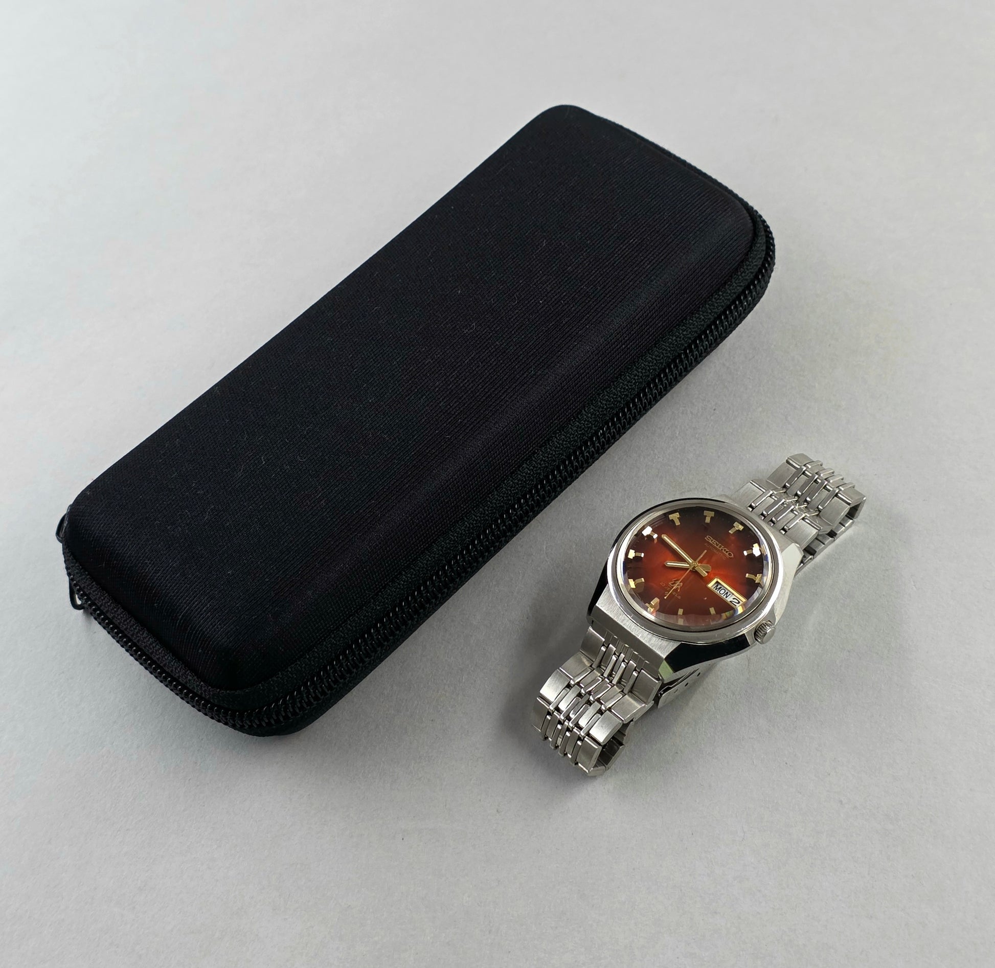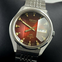 The Lord Matic (LM) series, which was part of Seiko's upper-middle-class collection in the early 1970s, holds great importance for the brand from both an aesthetic and technical perspective. The model you have in your possession, Ref. 5606-5320, is a standout among collectors with its cherry (dark red gradient) dial and multi-faceted (facet/prism) glass.