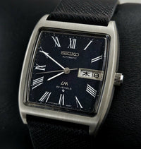 The Seiko Lord Matic 5606-5220 is a vintage automatic watch from the early 1970s. Stainless steel case, dark blue dial with Roman numerals and a patterned surface. A dress watch with a day and date complication. The watch is powered by Seiko's 5606 movement, a 23 jewel automatic movement. The Seiko LordMatic 5606-5220 is a classic and stylish watch that is perfect for everyday wear. The rectangular and relatively large case structure makes this product stand out from other Lord Matic models.