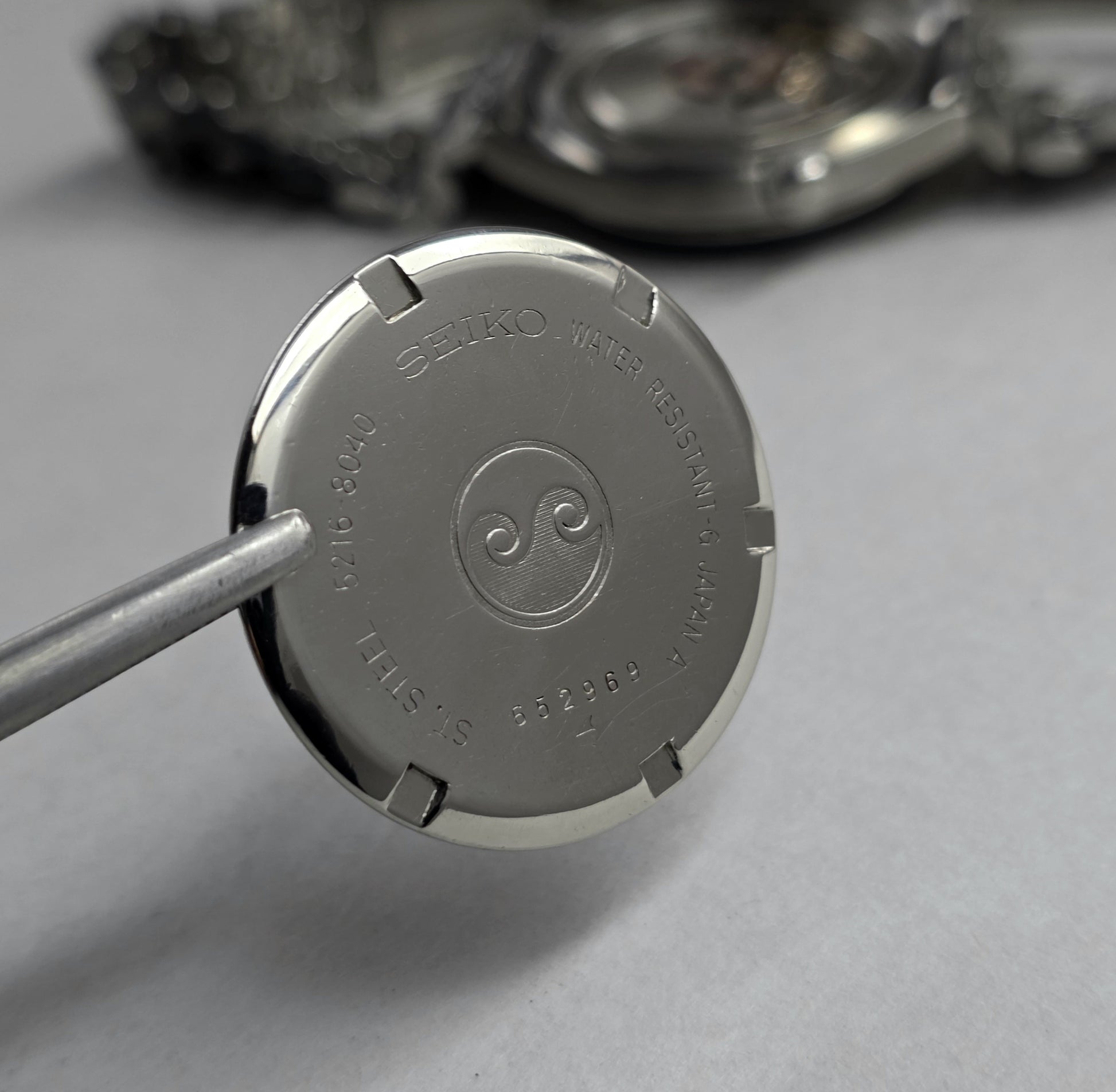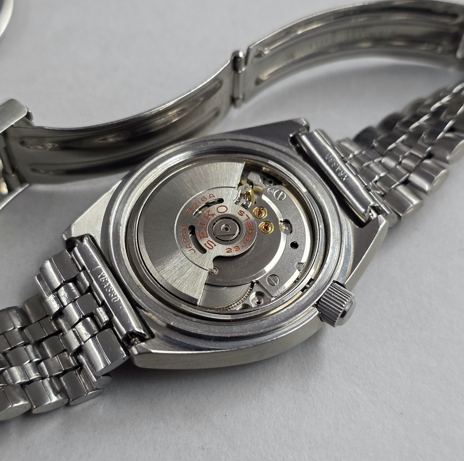 Inside is Seiko's high-quality 23-jewel 5216A automatic movement, operating at 28,800 vph. Featuring hacking and quick date/time setting capabilities, this caliber is one of the most successful and precise movements of its time. The screw-down crown system acts as a reliable shield protecting the movement from external factors.