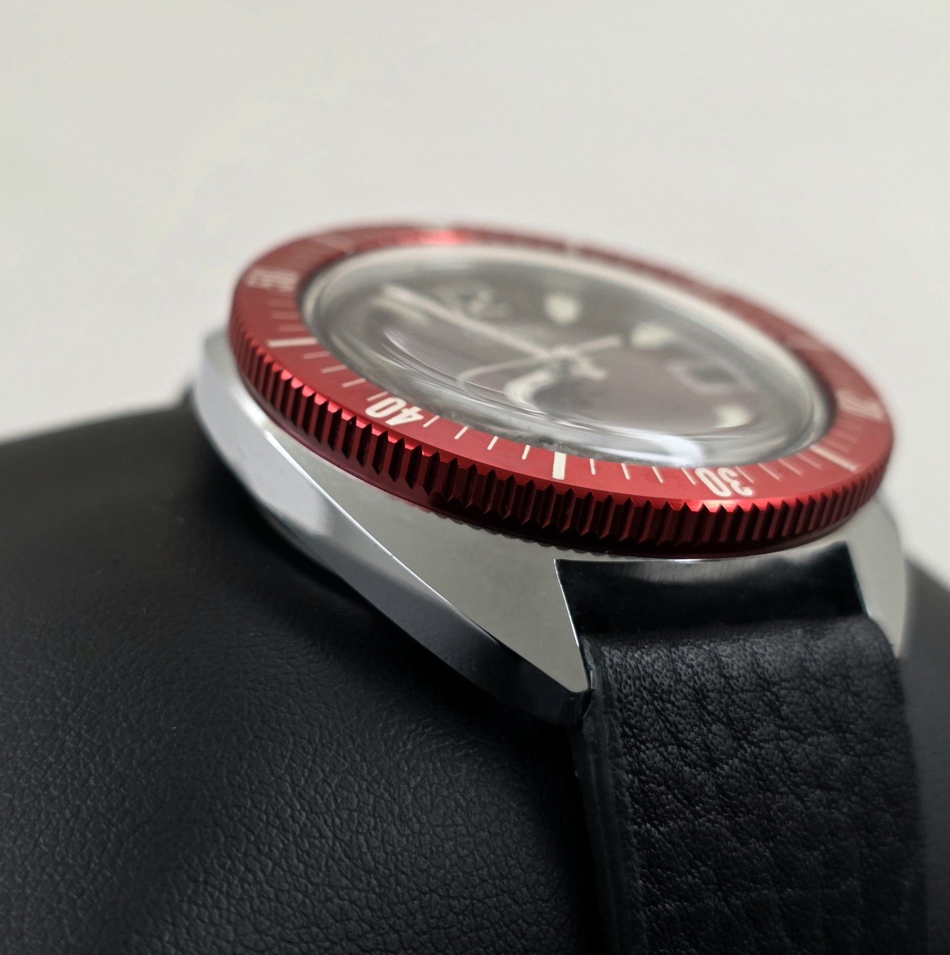 Seiko'nun yenilikçi ruhunu yansıtan bu model, kırmızı çerçevesi, bordo kadranı ve saf mekanik kalbiyle o dönemin sportif özgüvenini yansıtıyor.