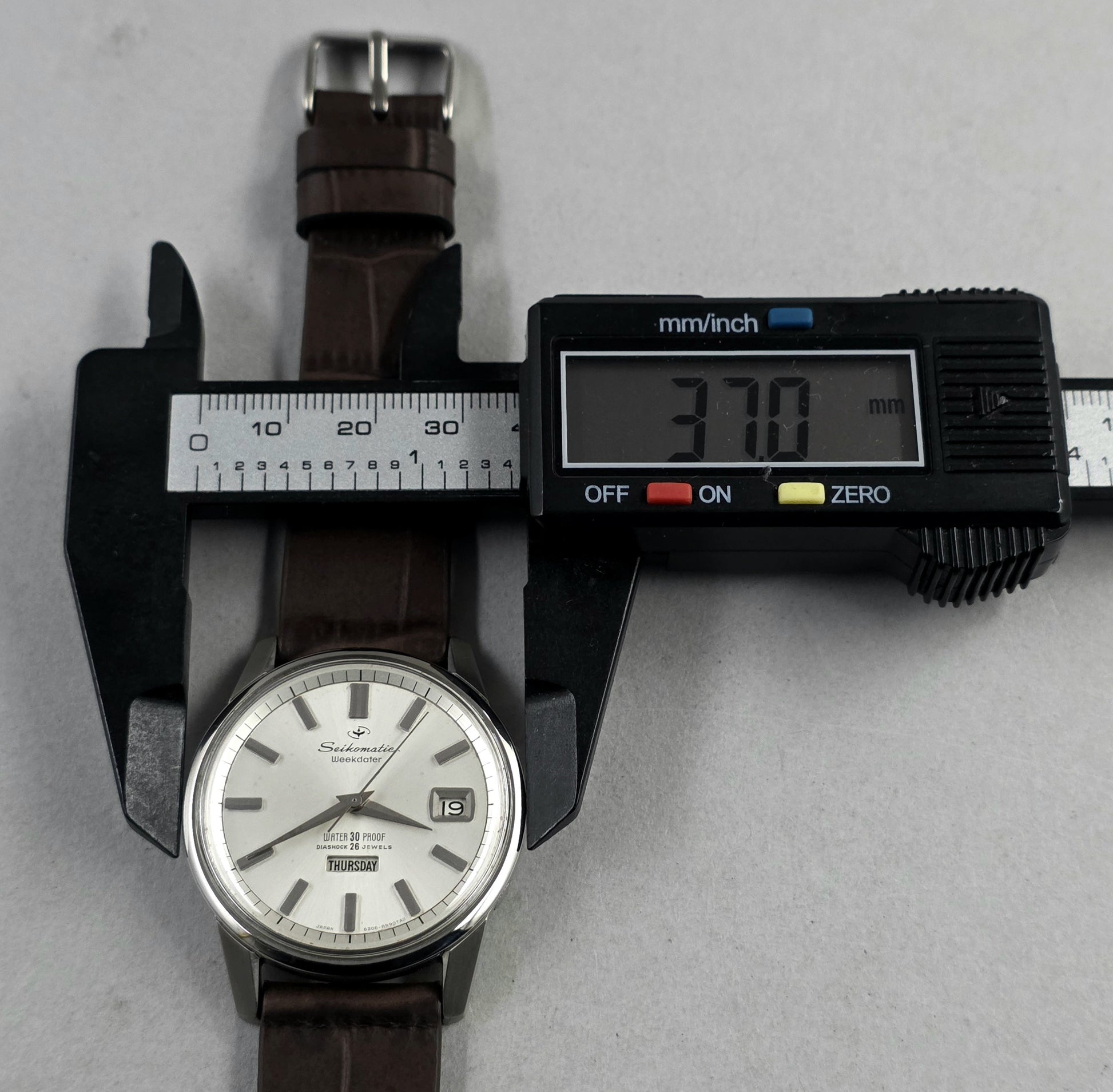 The silver dial with a sunburst pattern has acquired a slight patina that gains character with age. The date window at 3 o'clock and the fully inscribed day window at 6 o'clock create the dial's characteristic "Weekdater" identity. Applied indices and dauphine-style hands capture light perfectly, maximizing readability. The "Diashock 26 Jewels" inscription at the bottom of the dial points to Seiko's shock-absorbing technology and the quality of the movement.