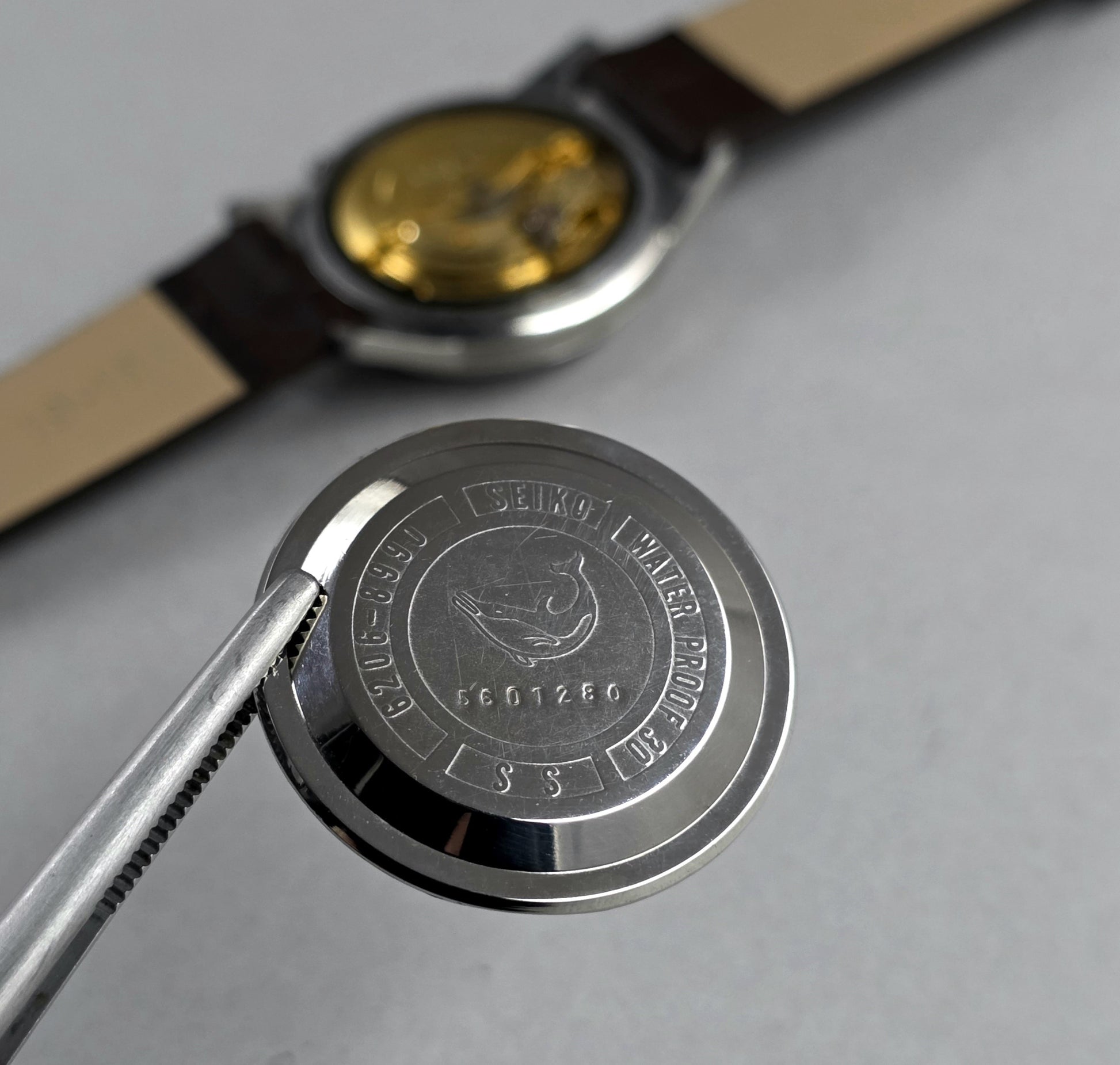 This Seikomatic, manufactured in June 1965, possesses collectible value both in its condition and its pristine, gilt-finished movement. The clarity of the dolphin logo and lettering on the case back is a crucial detail, indicating that the watch has not lost its shape through polishing. This 60-year-old Japanese legend is one of the most vivid witnesses to Seiko's golden age of mechanical watchmaking.